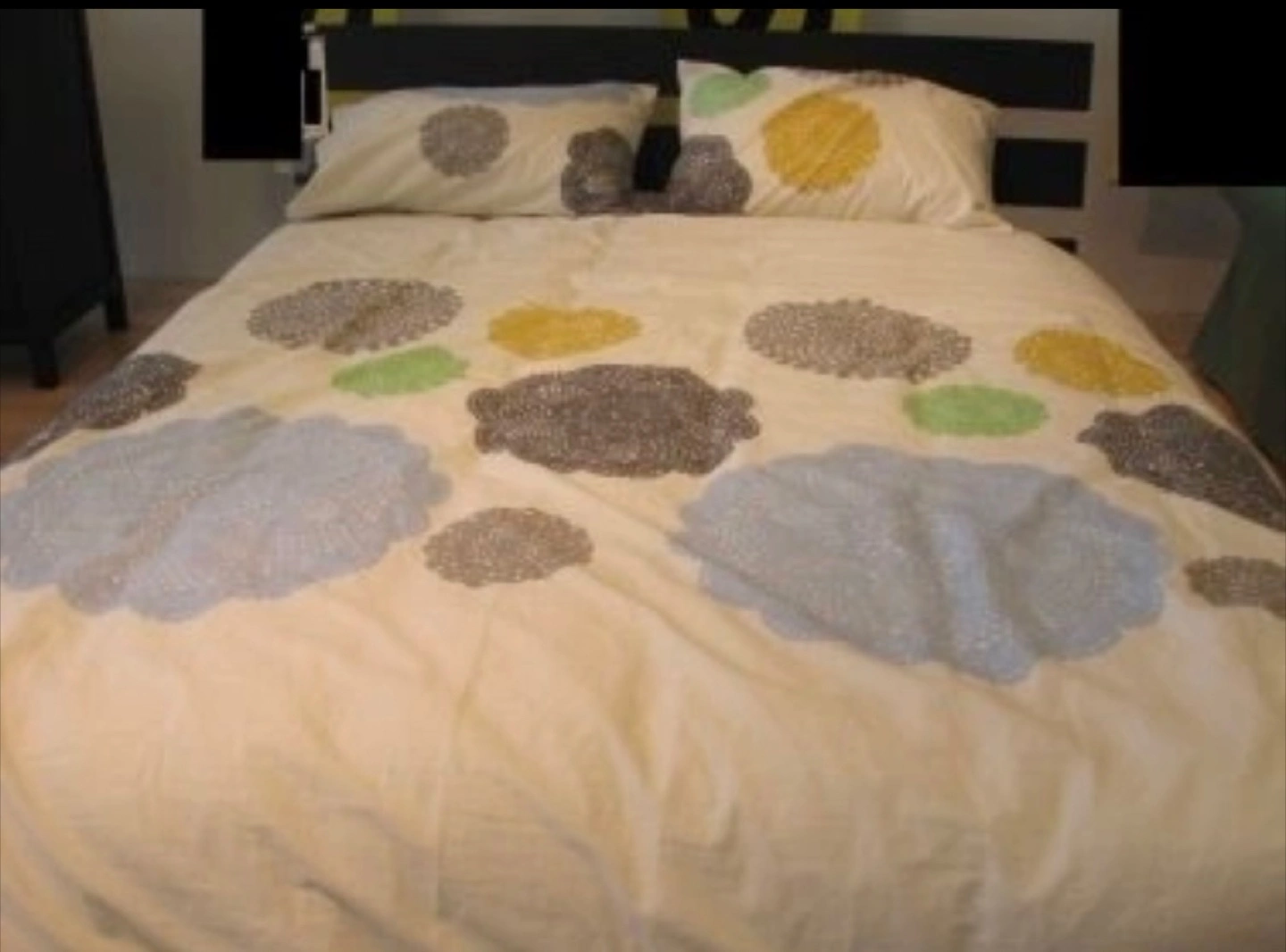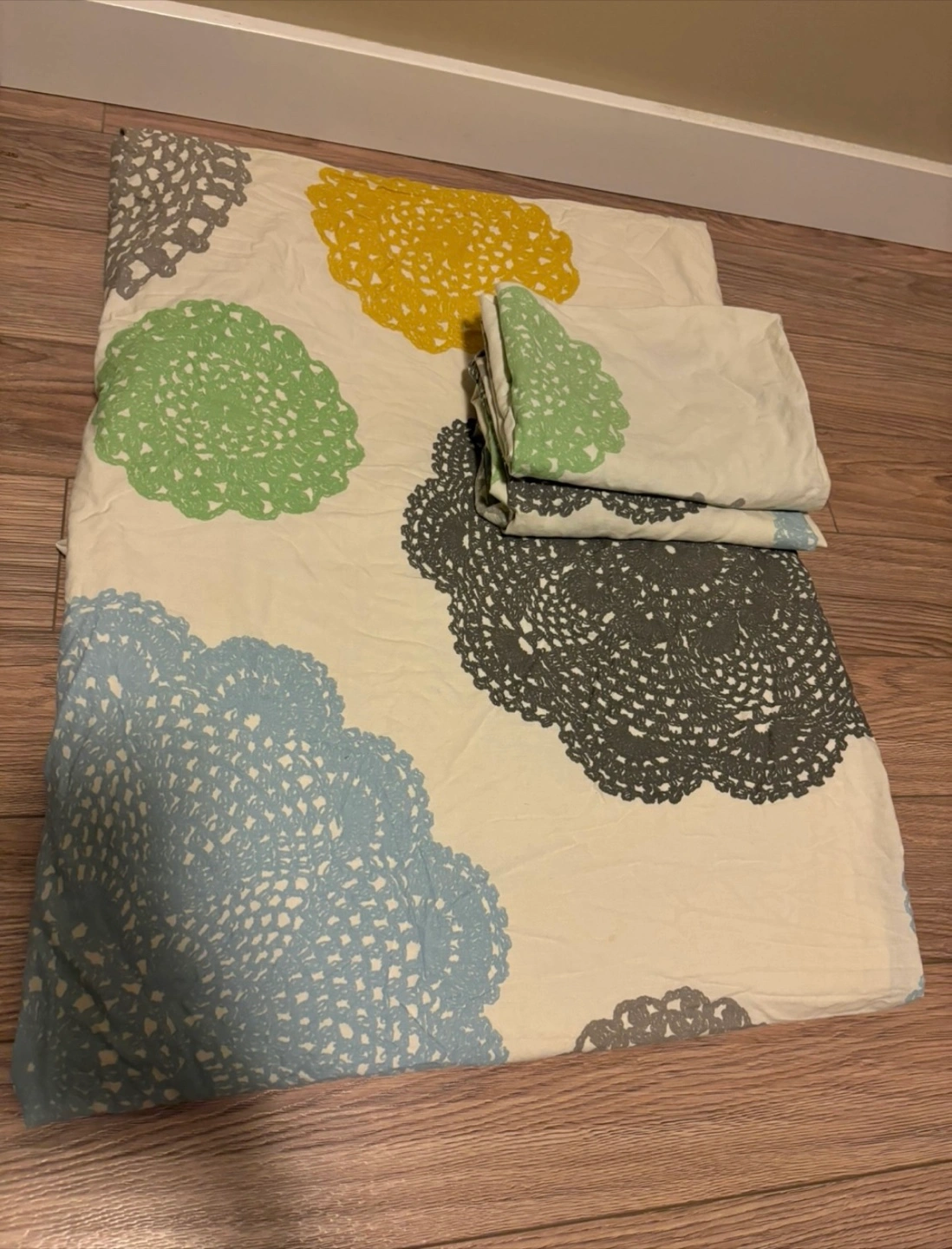 Beautiful Queen size duvet cover and 2 pillow cases, made of 100% cotton. Machine washable, tumble dry. Snap closure at bottom.