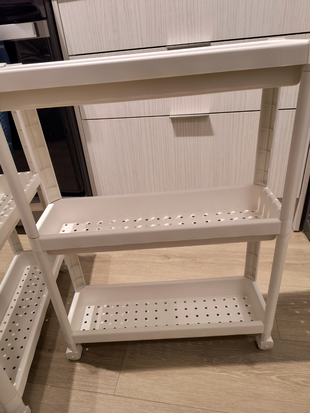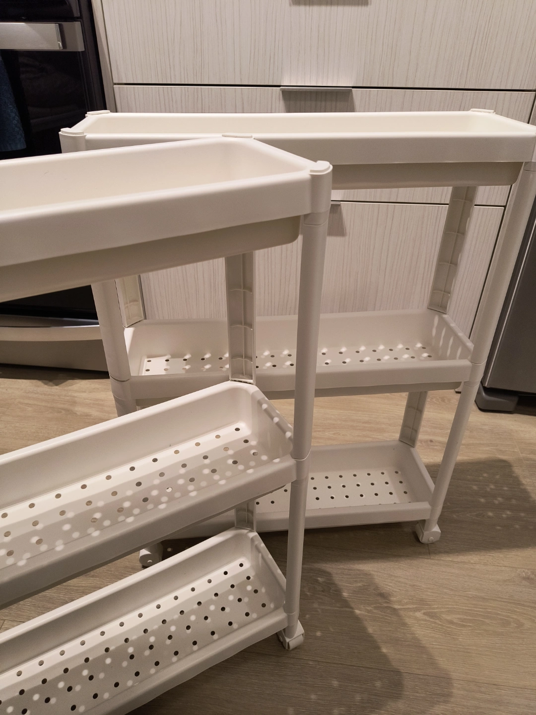Pair of three-tier rolling storage carts. White plastic construction. Great for organizing kitchens, pantries, or bathrooms. Small wheels for easy mobility.