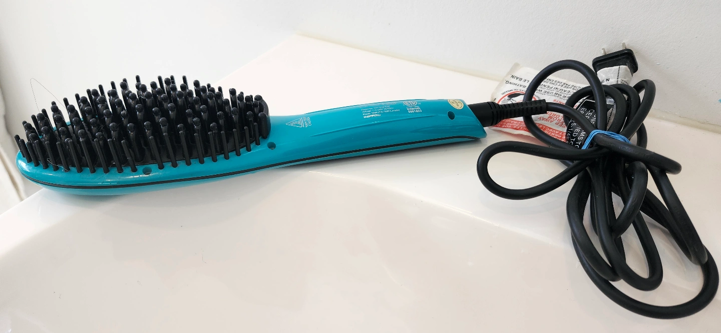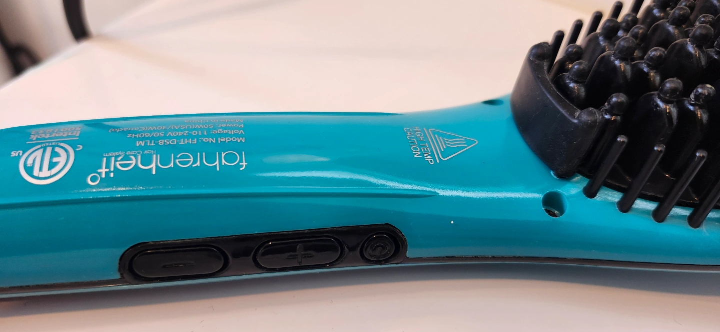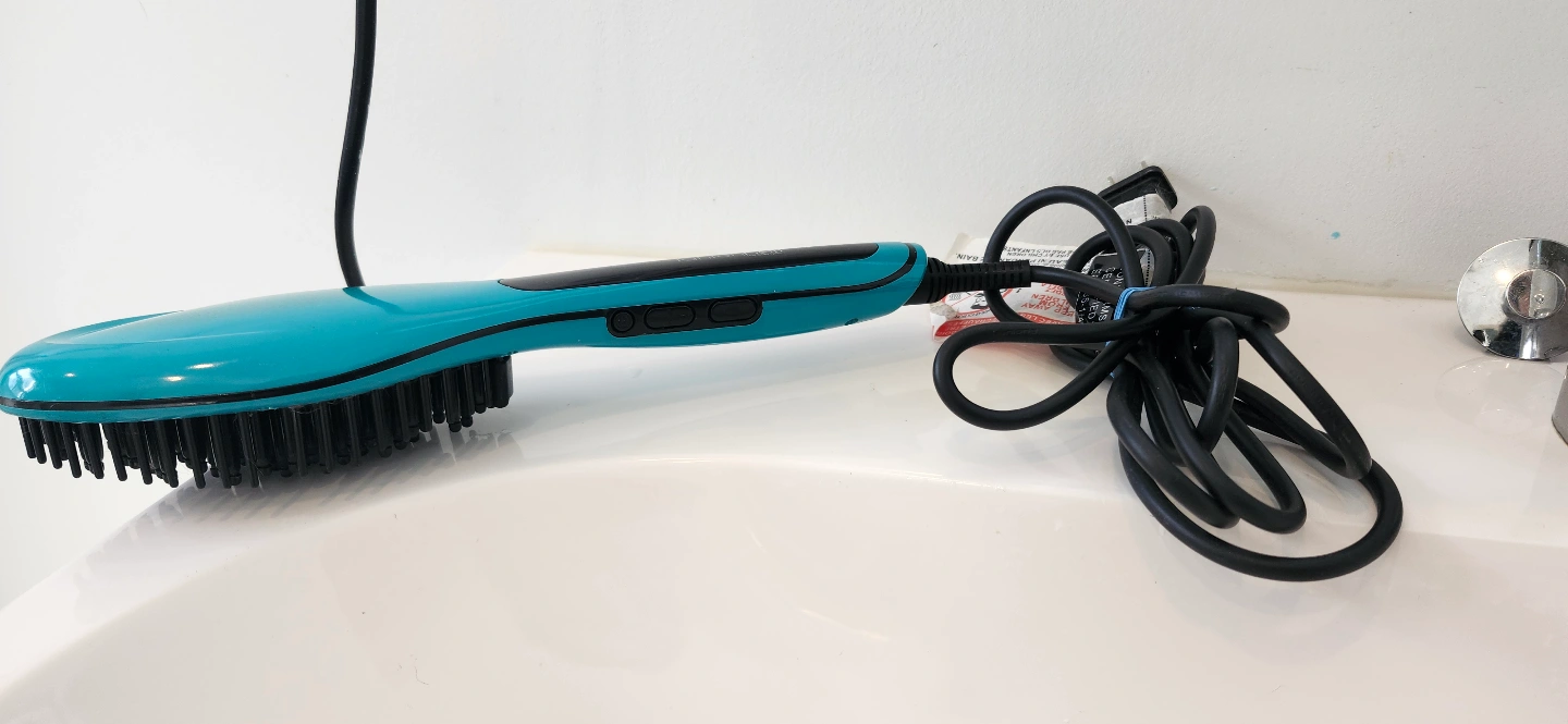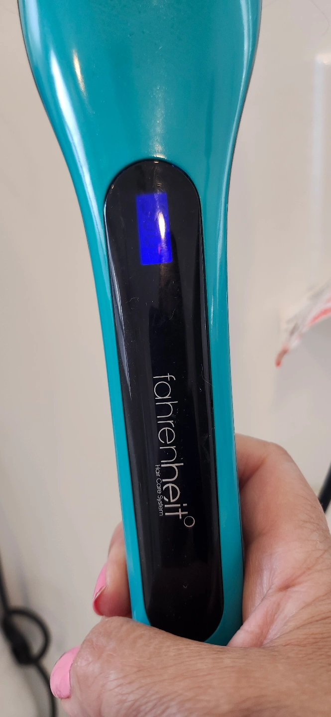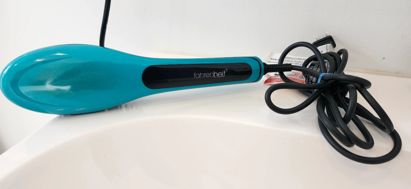 Teal hot air brush. Features a digital temperature display and multiple heat settings. Includes power cord. Gently used.