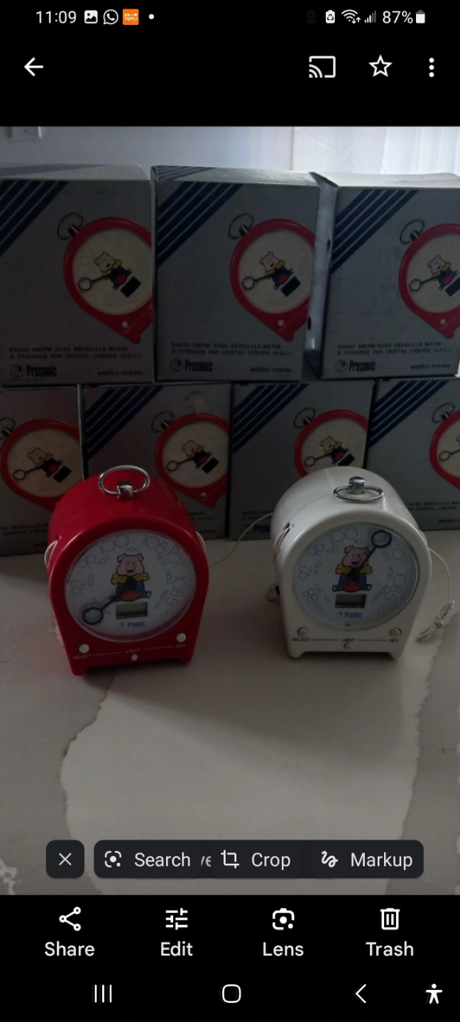 9Pair of vintage Presonic AM/FM clock radios. Features a unique piggy design. Red and white colours available. Comes in original boxes.