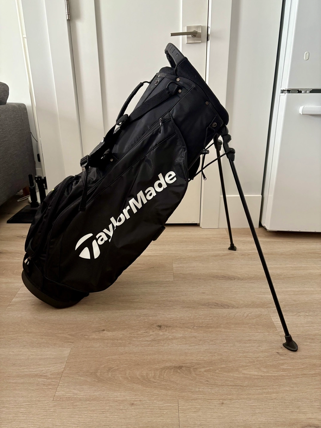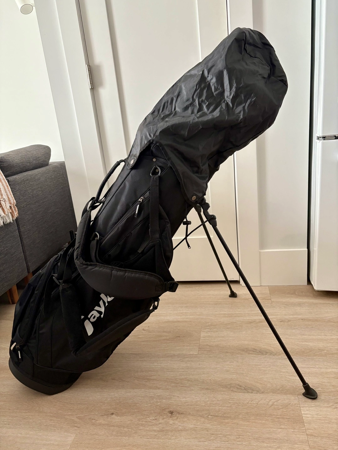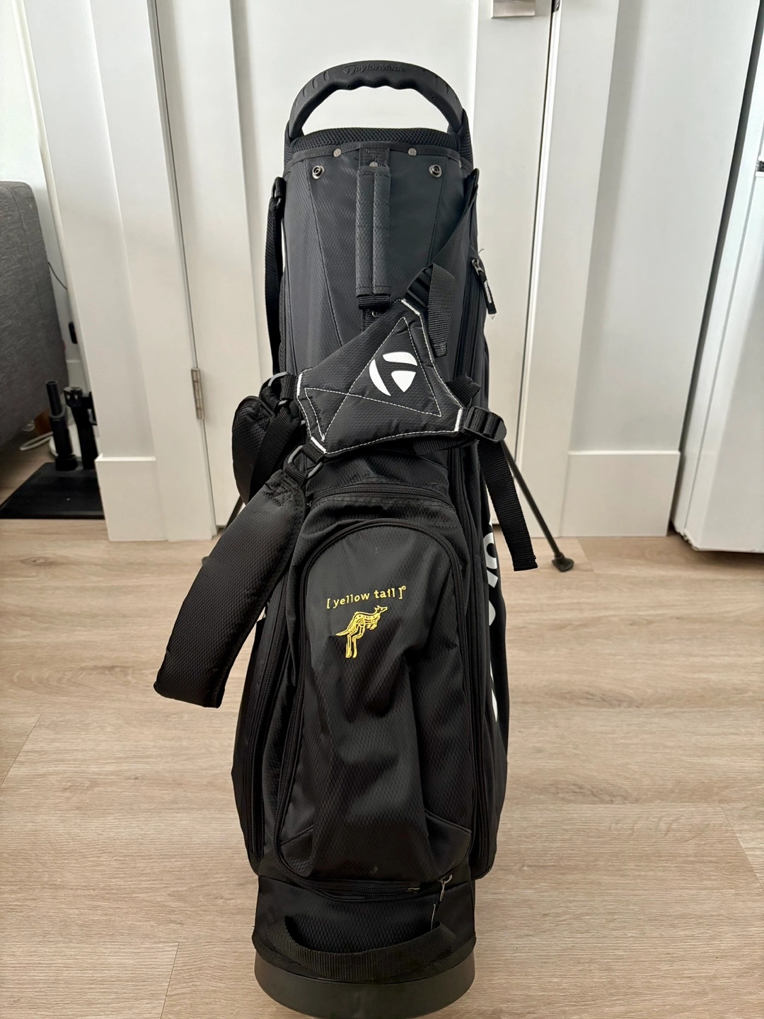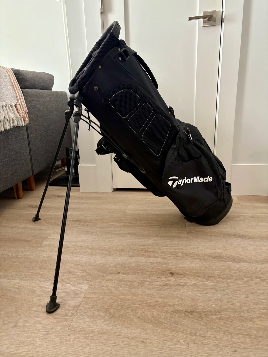 Taylor Made men’s black extra-light golf bag. Never used on a golf course and in near new condition. Comes with legs, shoulder straps, and a top rain cover to protect your clubs. Super lightweight, balanced, and sturdy.