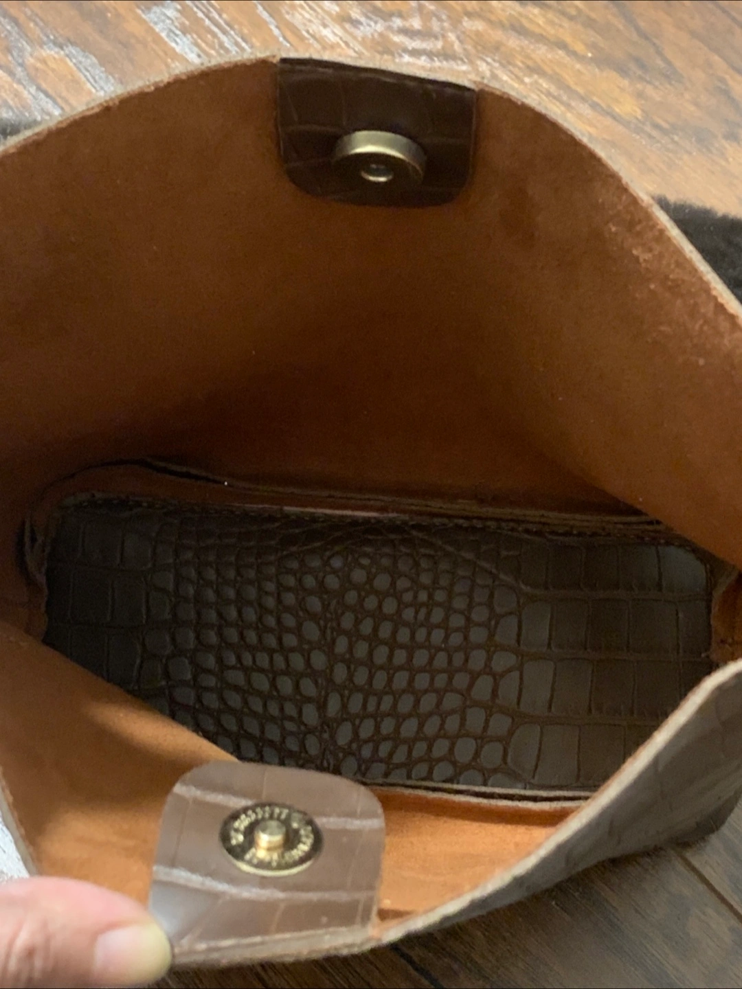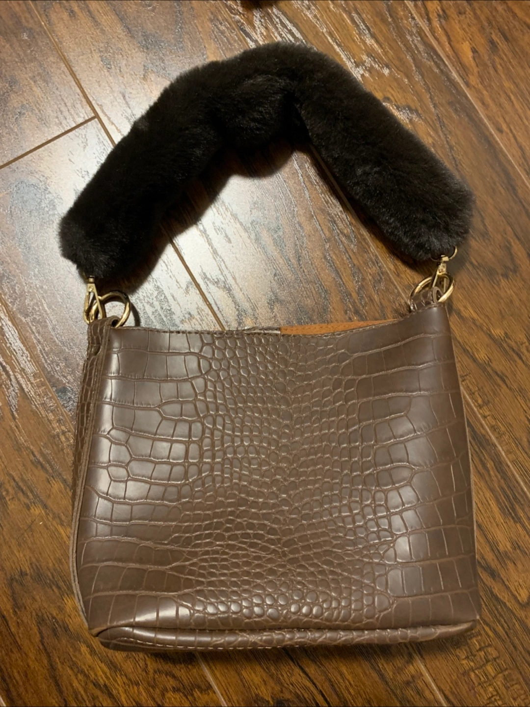 Stylish handbag. Features crocodile-embossed faux leather exterior and a detachable faux fur shoulder strap. Brown colour. Interior features matching lining. Small, perfect for everyday use.