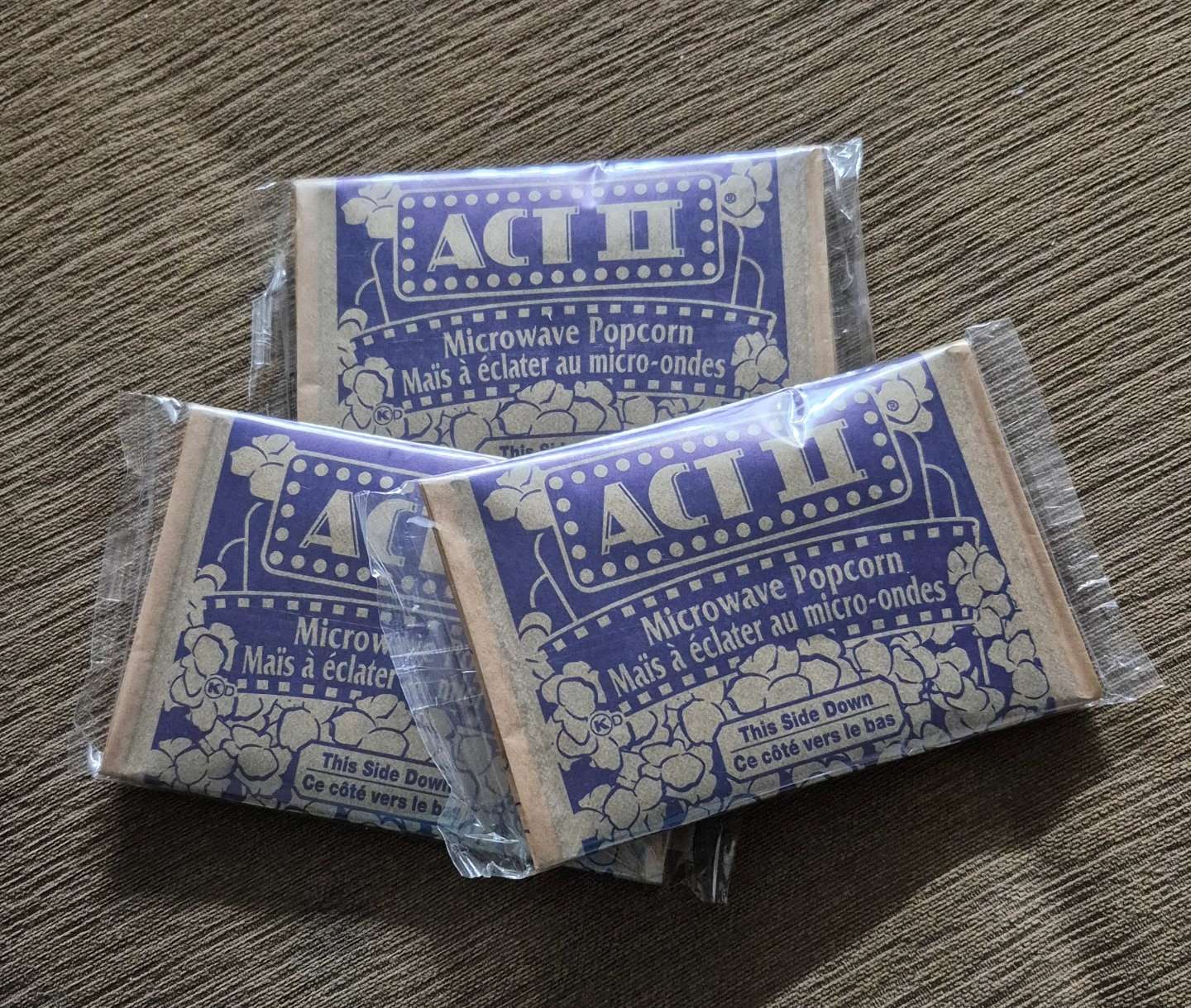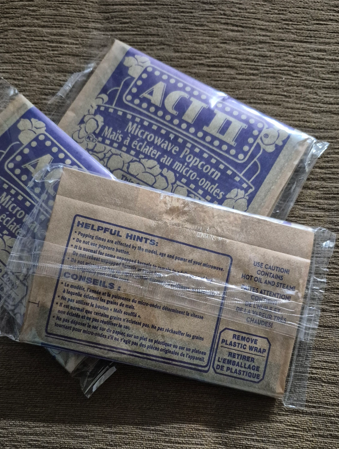 Three unopened packs of Act II microwave popcorn. French and English instructions. EXPIRED but sealed, in case anyone wants them.