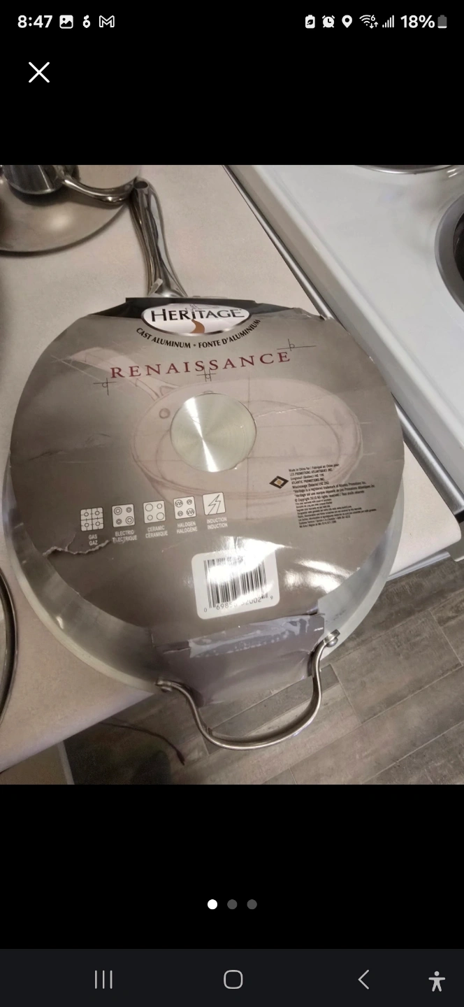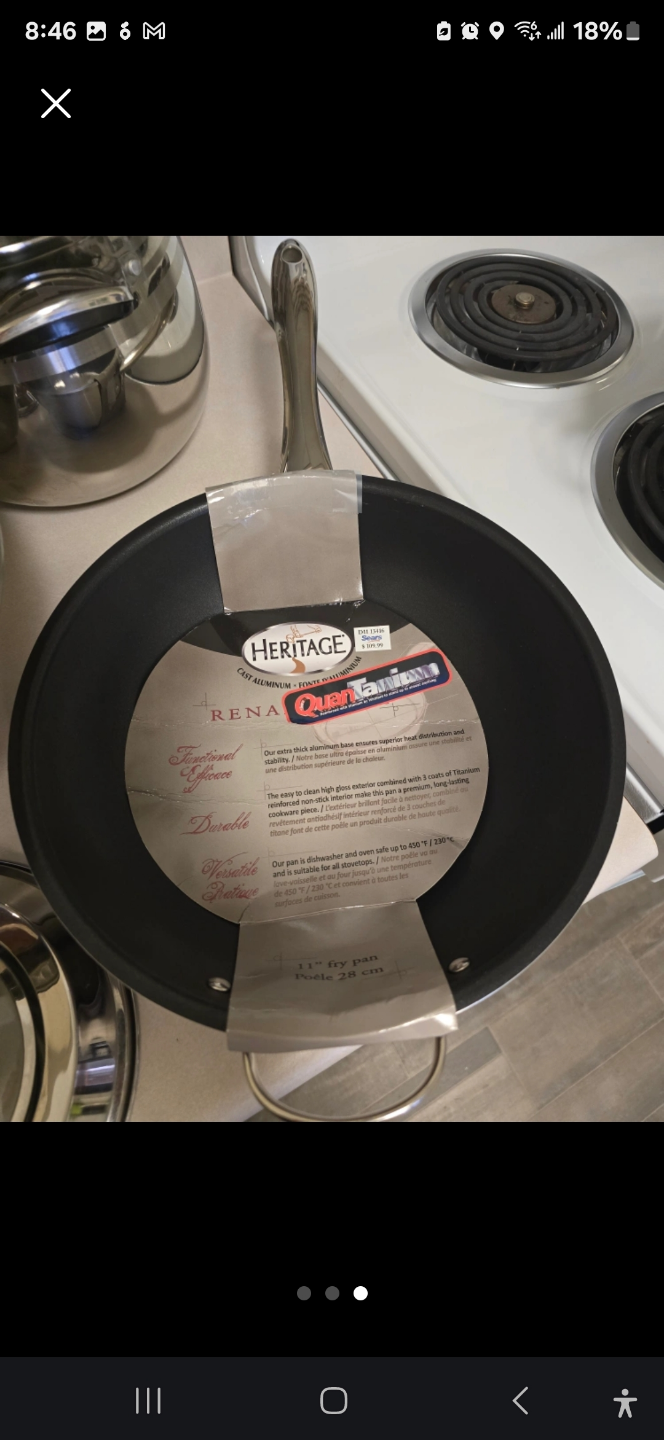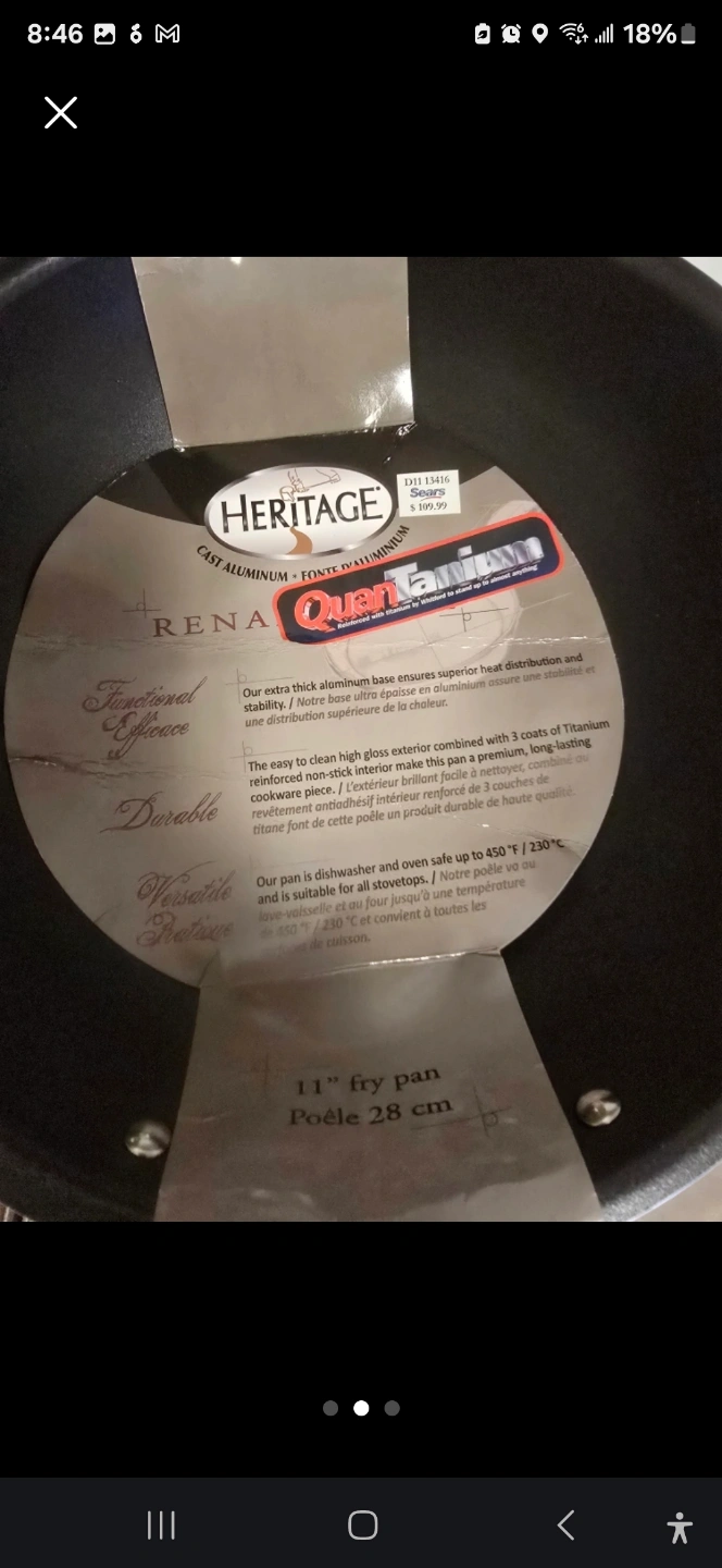 New in box, 11-inch cast aluminum fry pan. Features a thick base for superior heat distribution and easy cleaning. Oven safe up to 450°F / 230°C. Dishwasher safe.