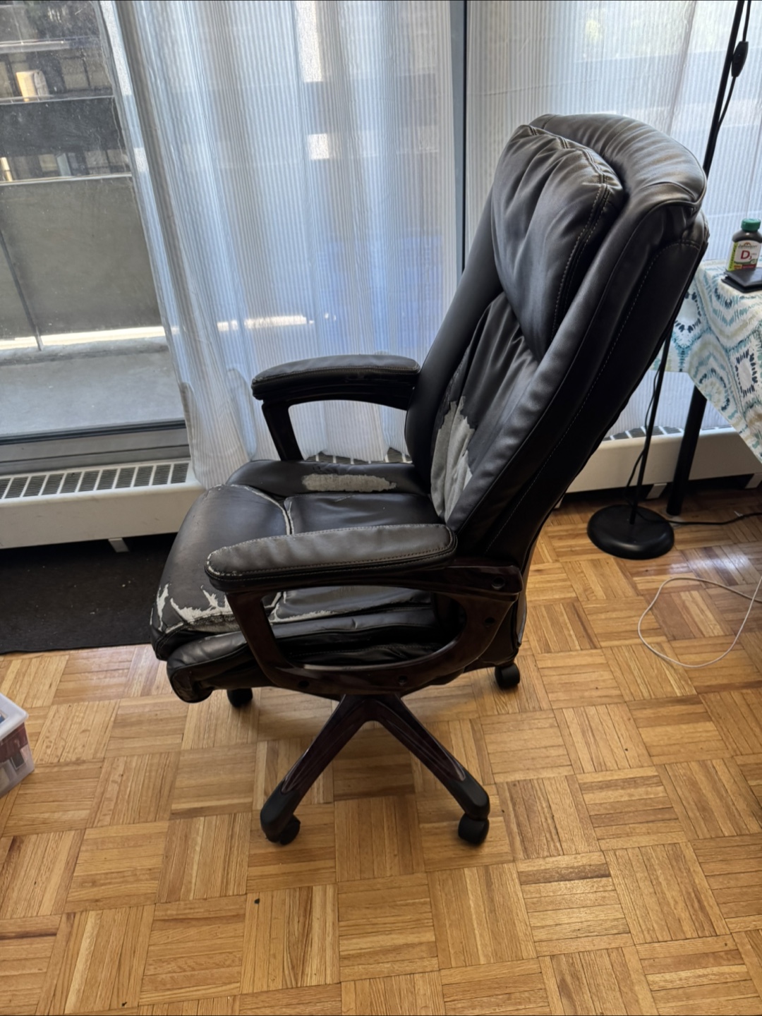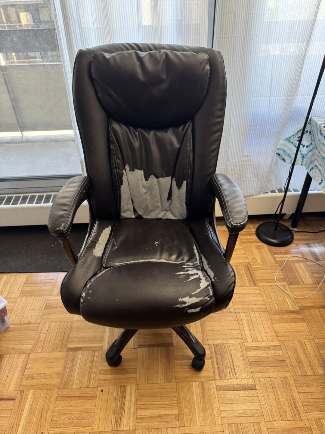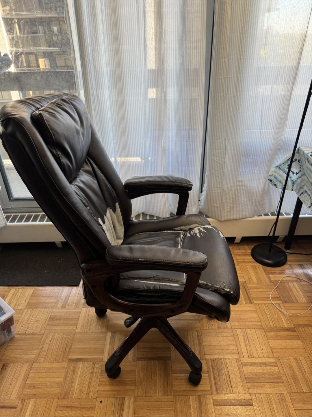 Used office chair, brown leather. Some wear and tear on the seat and arms. Features adjustable height and rolling wheels. Good for home office or workspace.