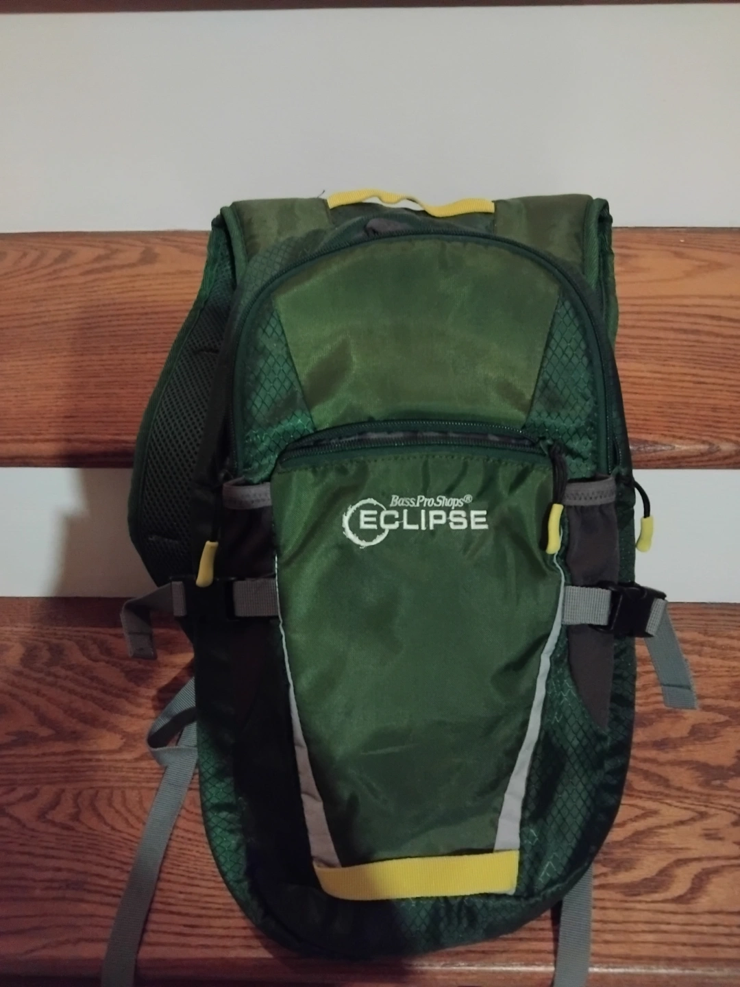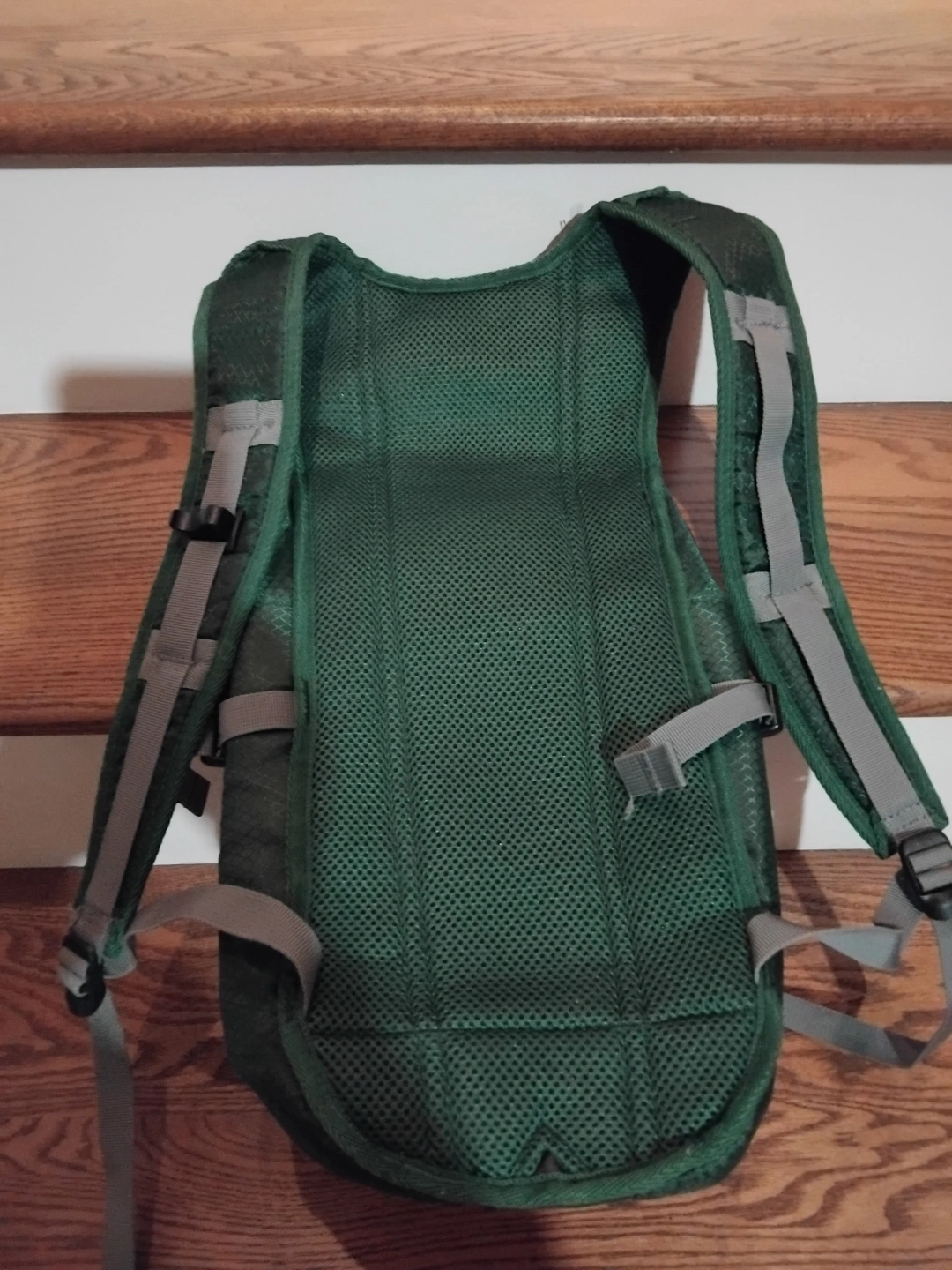 Lightly used hydration pack. Green with grey and yellow accents. Includes hydration bag. Small front pocket. Adjustable straps. Great for hiking or other outdoor activities.