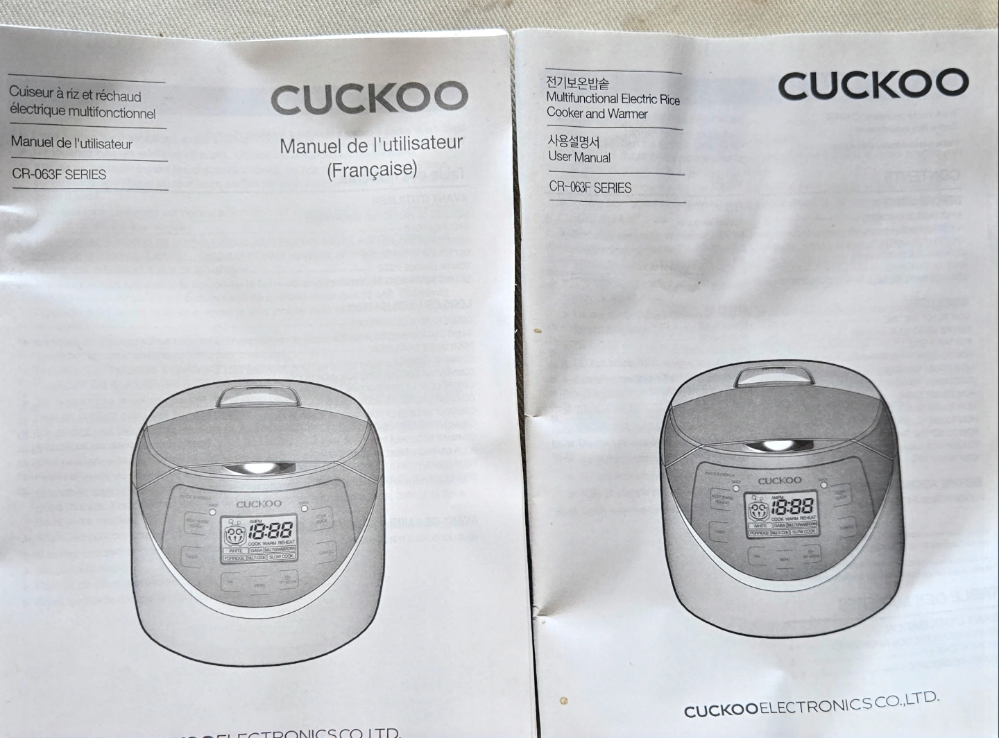70Used Cuckoo rice cooker. Model CR-0632F. Features multiple cooking functions: white rice, GABA, multigrain, porridge, multi-cook, and slow cook. Includes user manual.