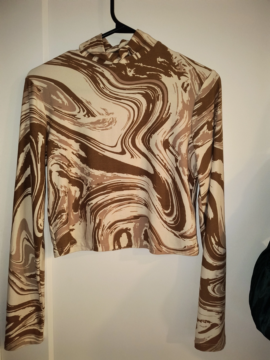 Long sleeve crop top. Mock neck. Brown and beige marble print. Soft material. Great for layering.