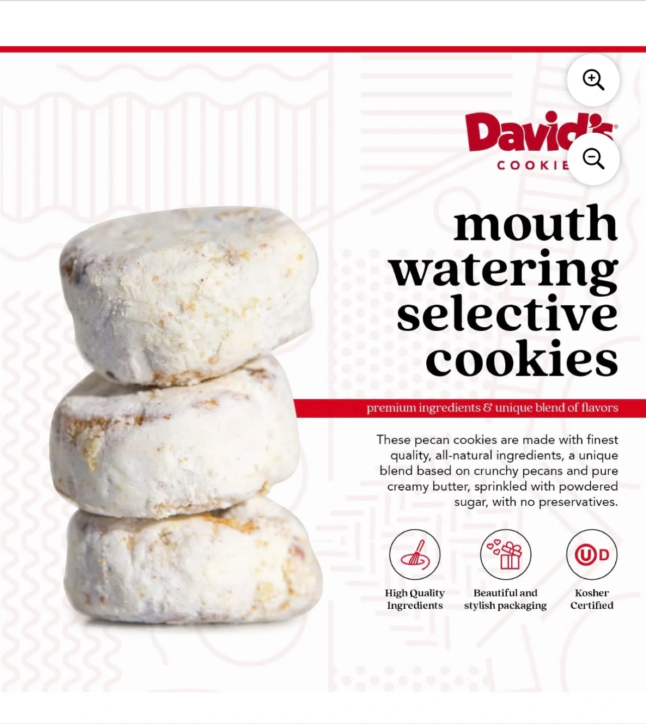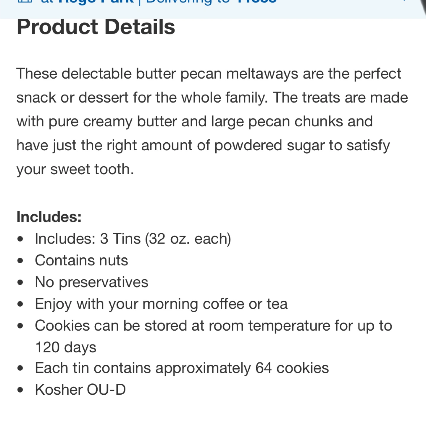 Delicious butter pecan cookies. Melt-in-your-mouth goodness. Kosher certified. Comes in a festive red tin. Perfect gift.