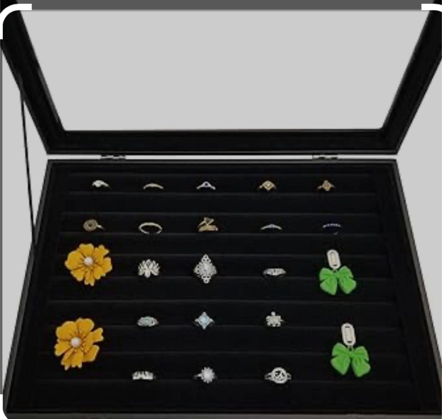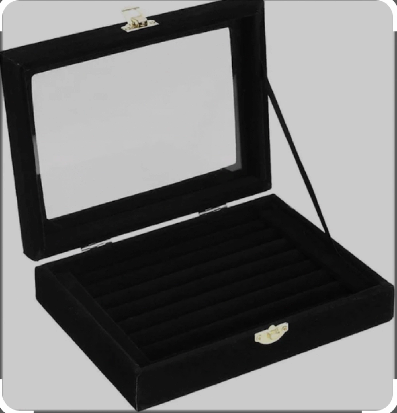 Black velvet jewelry box. Clear glass top. Multiple slots for rings and other jewelry. Perfect for storage and display.