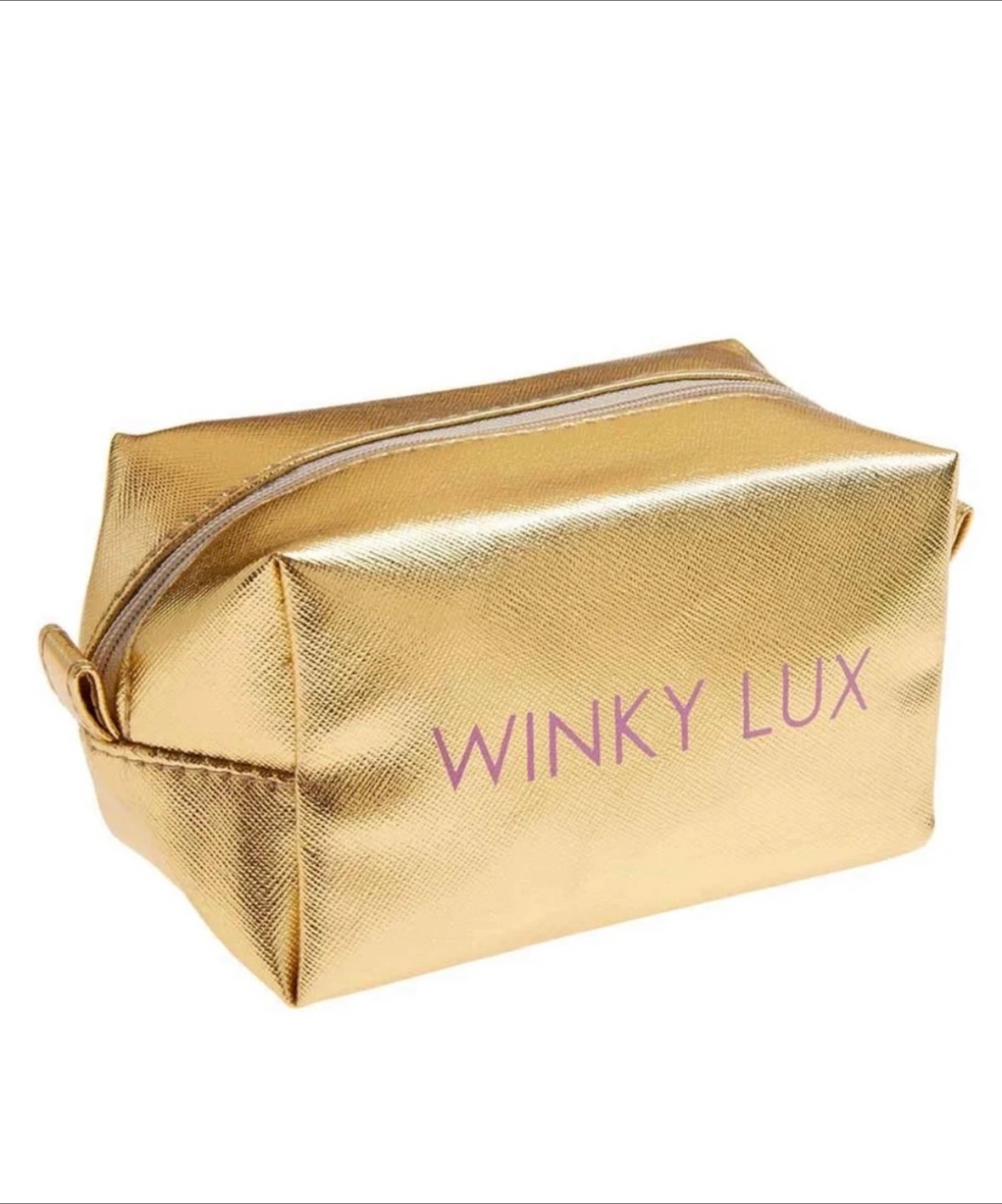 Gold cosmetic bag. Zipper closure. Great for travel.