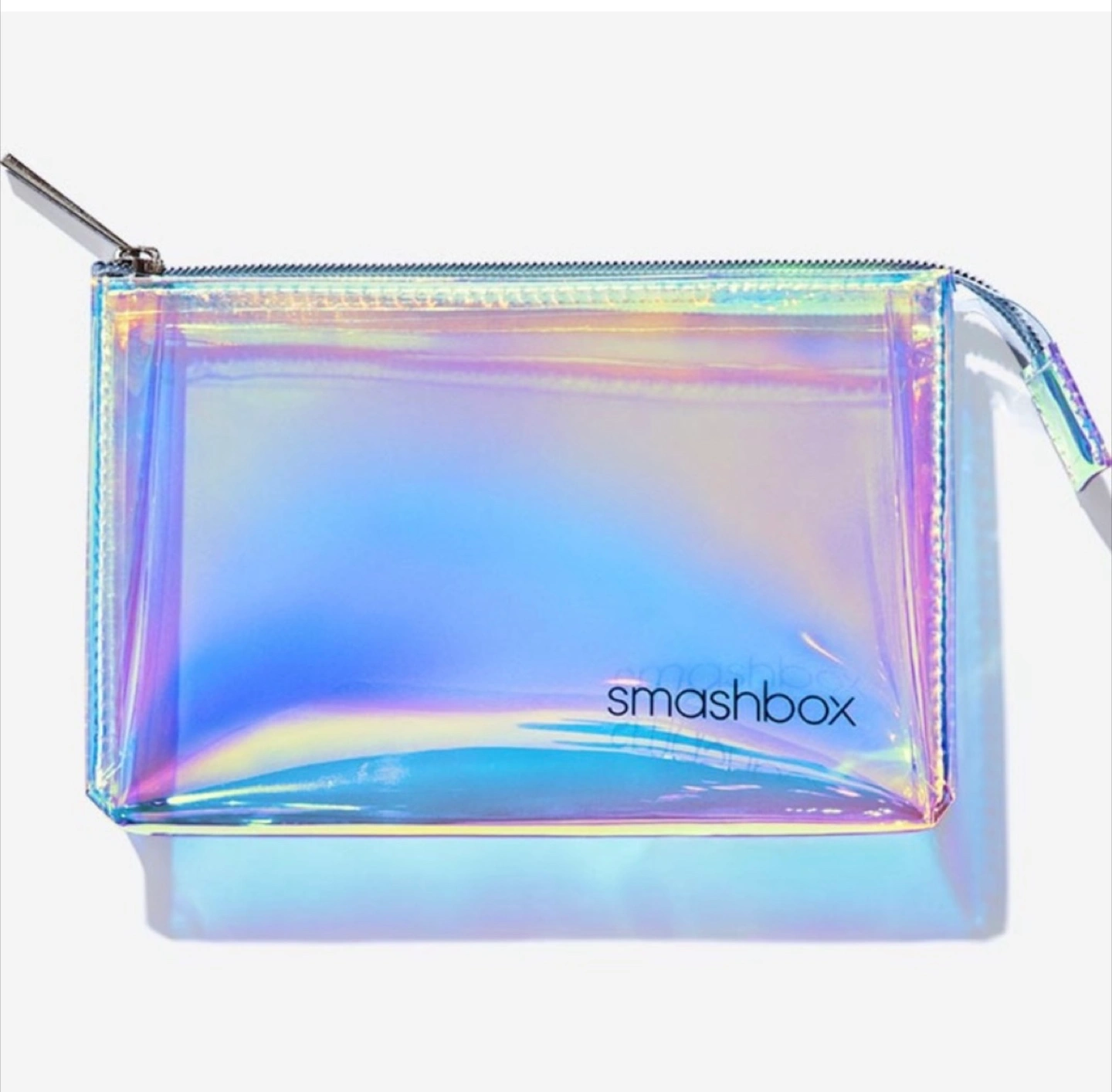 iridescent cosmetic bag. Clear PVC material with silver zipper. Perfect for travel or everyday use. Smashbox logo printed on the front.