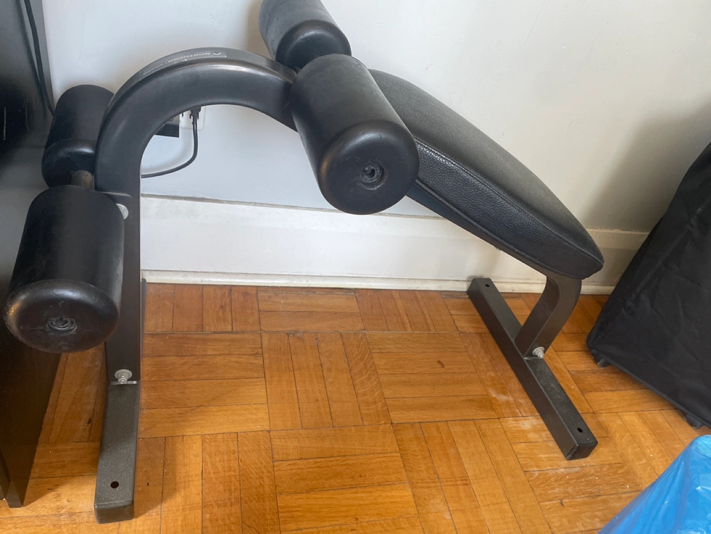 422Workout bench. Great for back exercises. Features padded backrest and arm supports. Durable steel frame. Used condition.