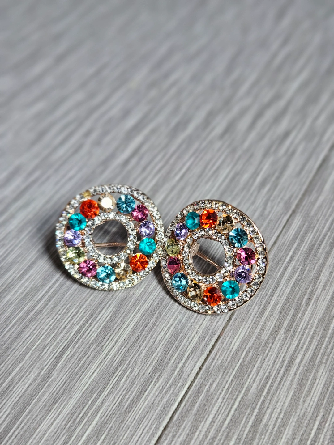 Beautiful pair of earrings. Round design. Multicolored crystals. Gold-tone metal. Perfect for adding a pop of color to any outfit.