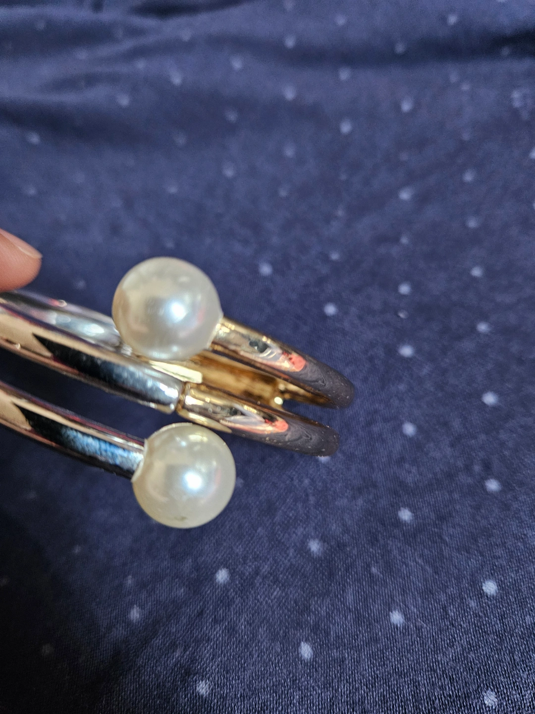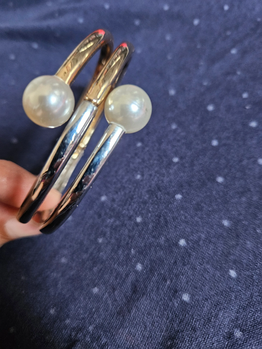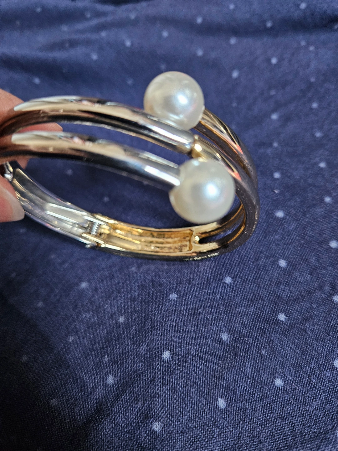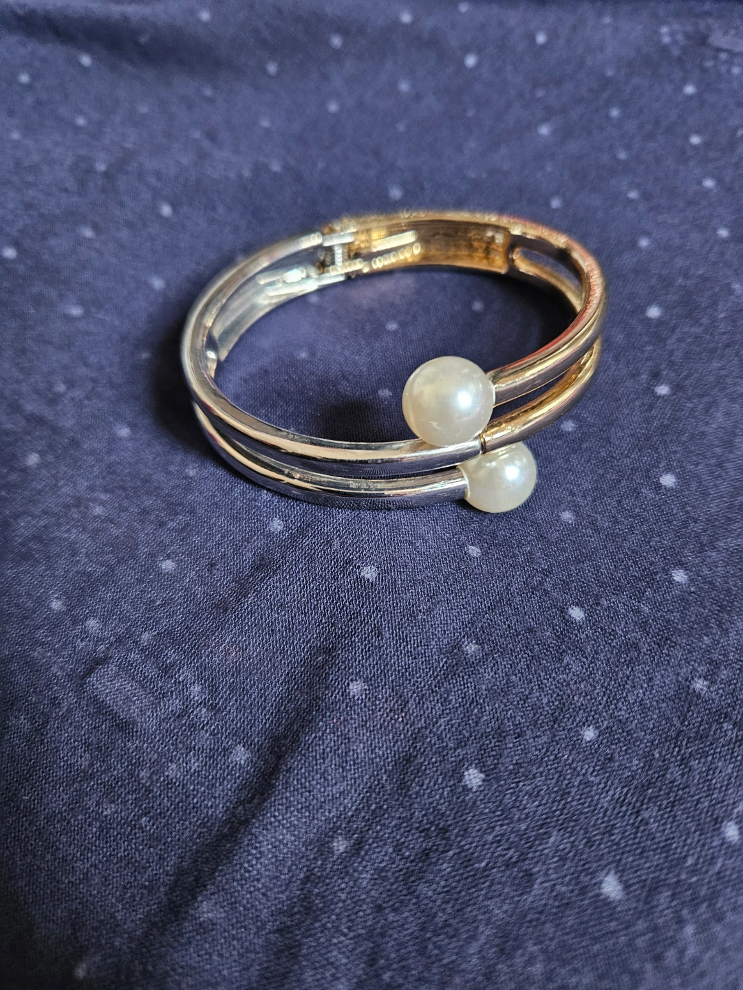 Beautiful bracelet. Features two bands of metal, gold and silver. Decorated with two faux pearls. Clasp closure. Perfect accessory for any occasion.