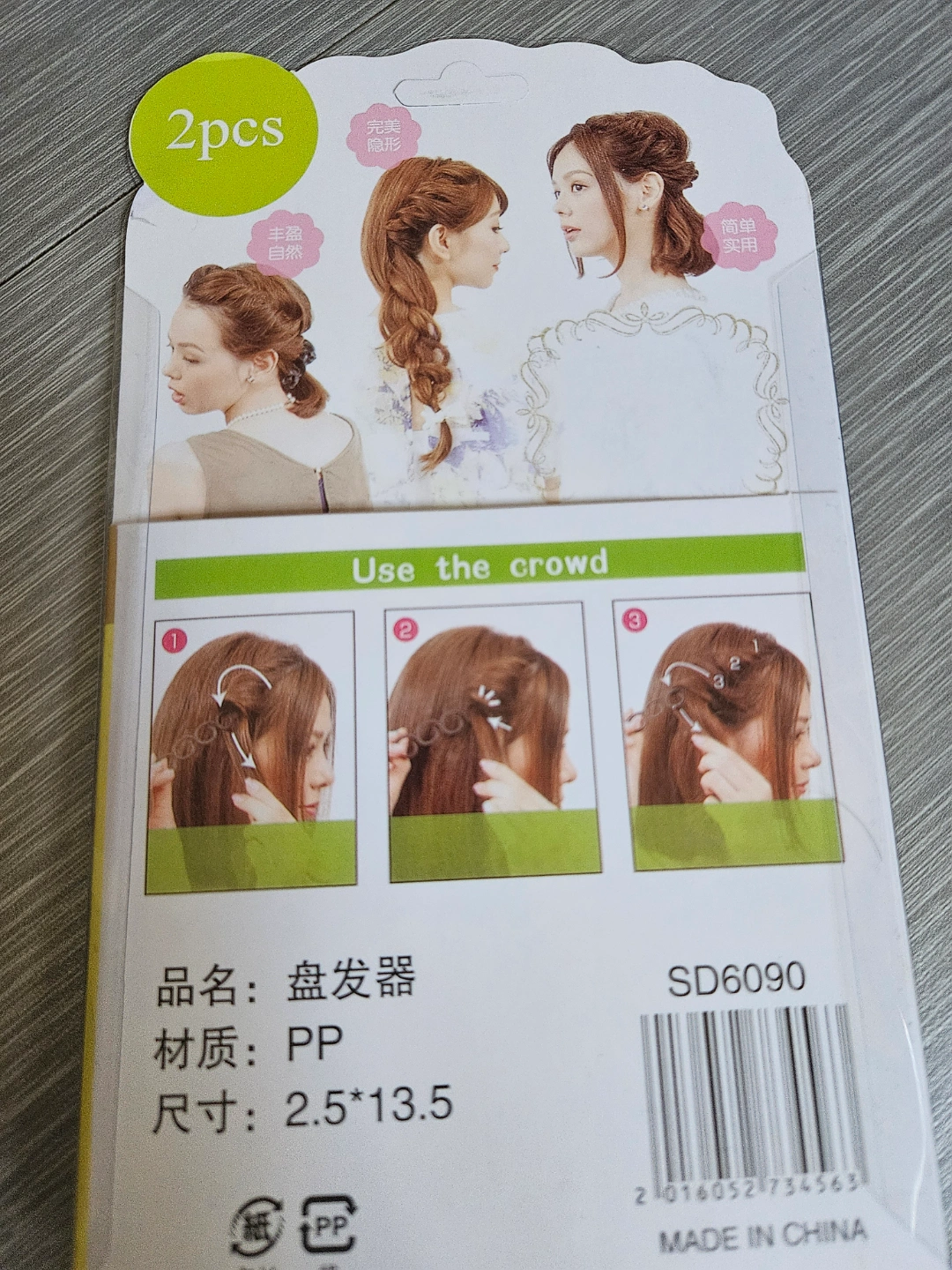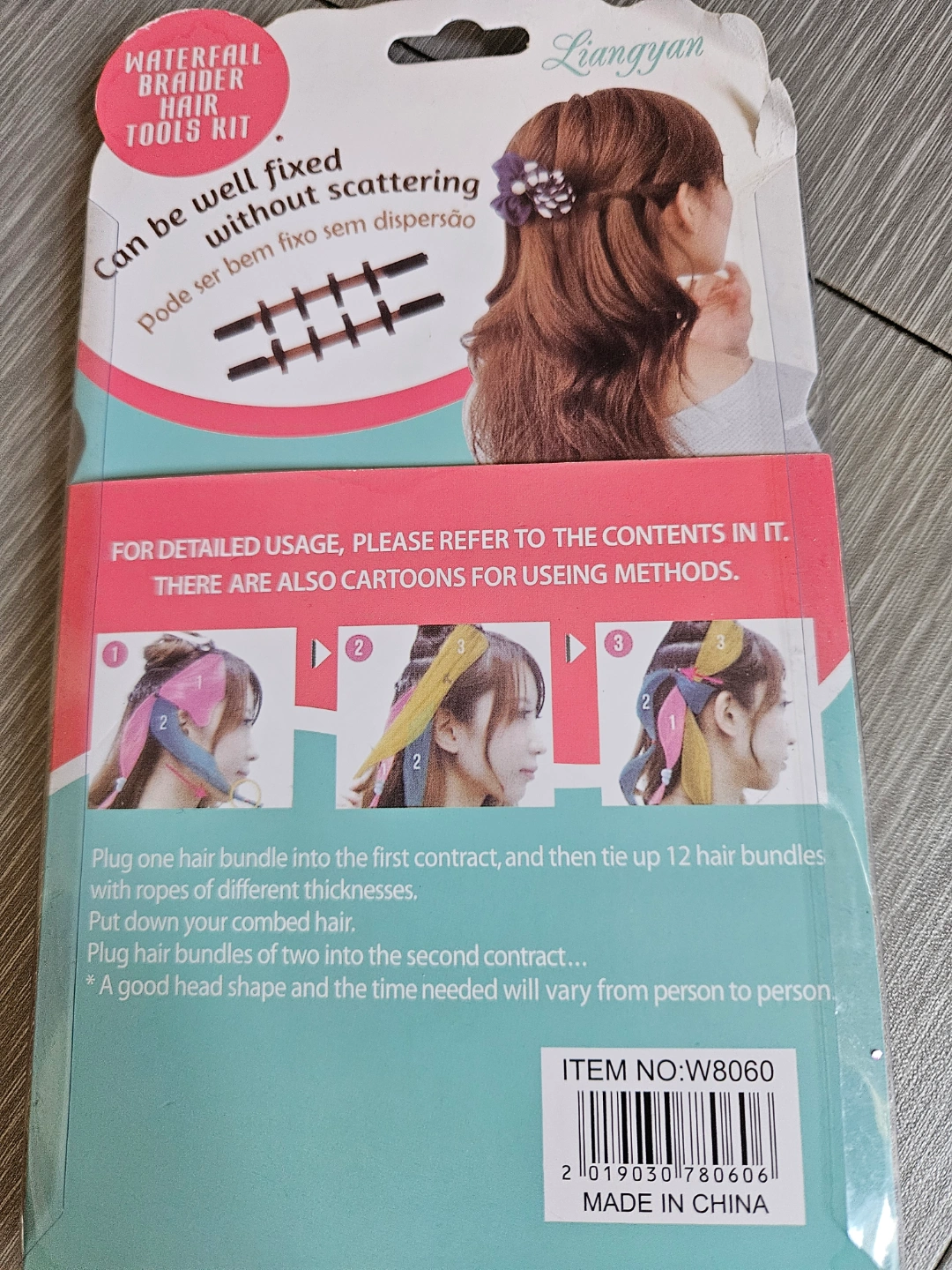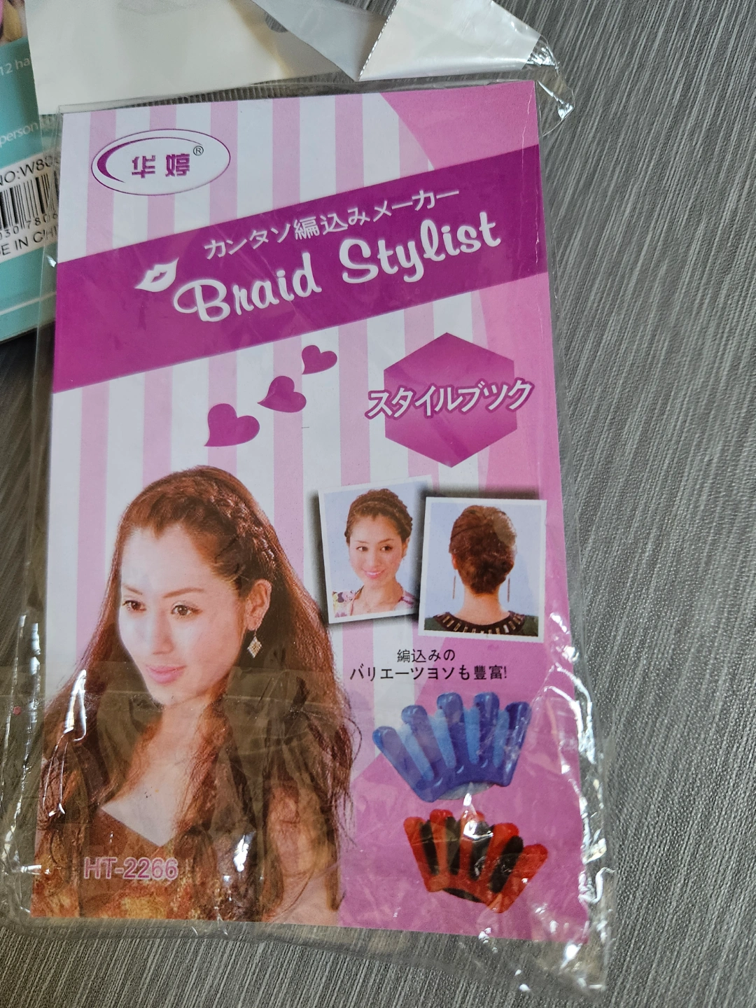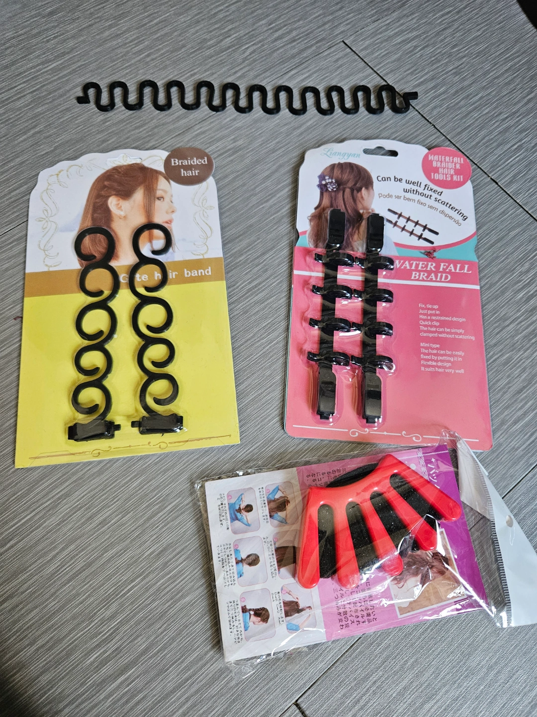 Assorted hair braiding tools. Includes multiple clips and bands. Perfect for creating various hairstyles. Easy to use instructions included. Made in China.