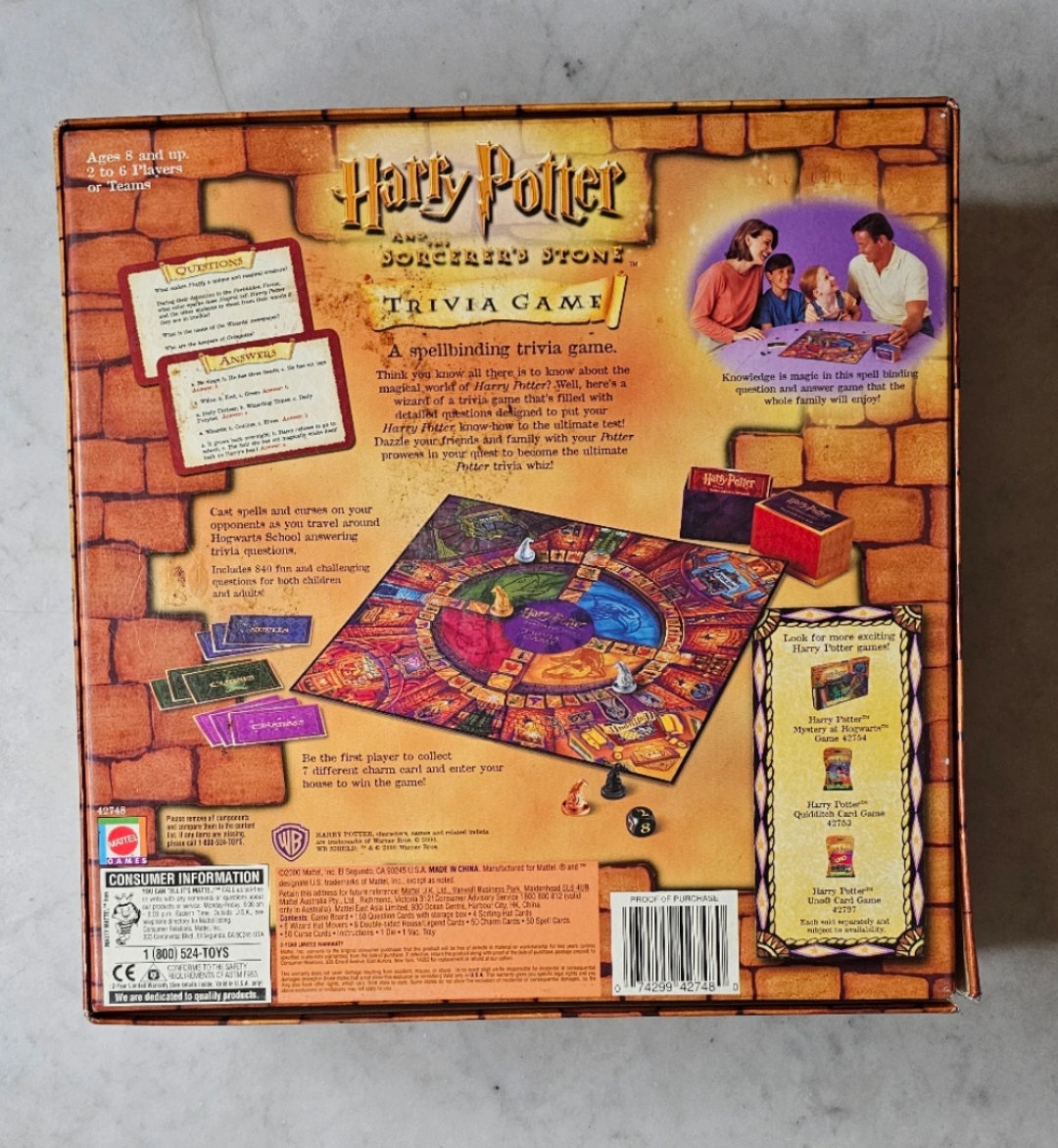 Vintage Harry Potter board game for ages 8 and up. 2 to 6 players. Includes game board, question cards, and game pieces. Test your Harry Potter knowledge with friends and family!