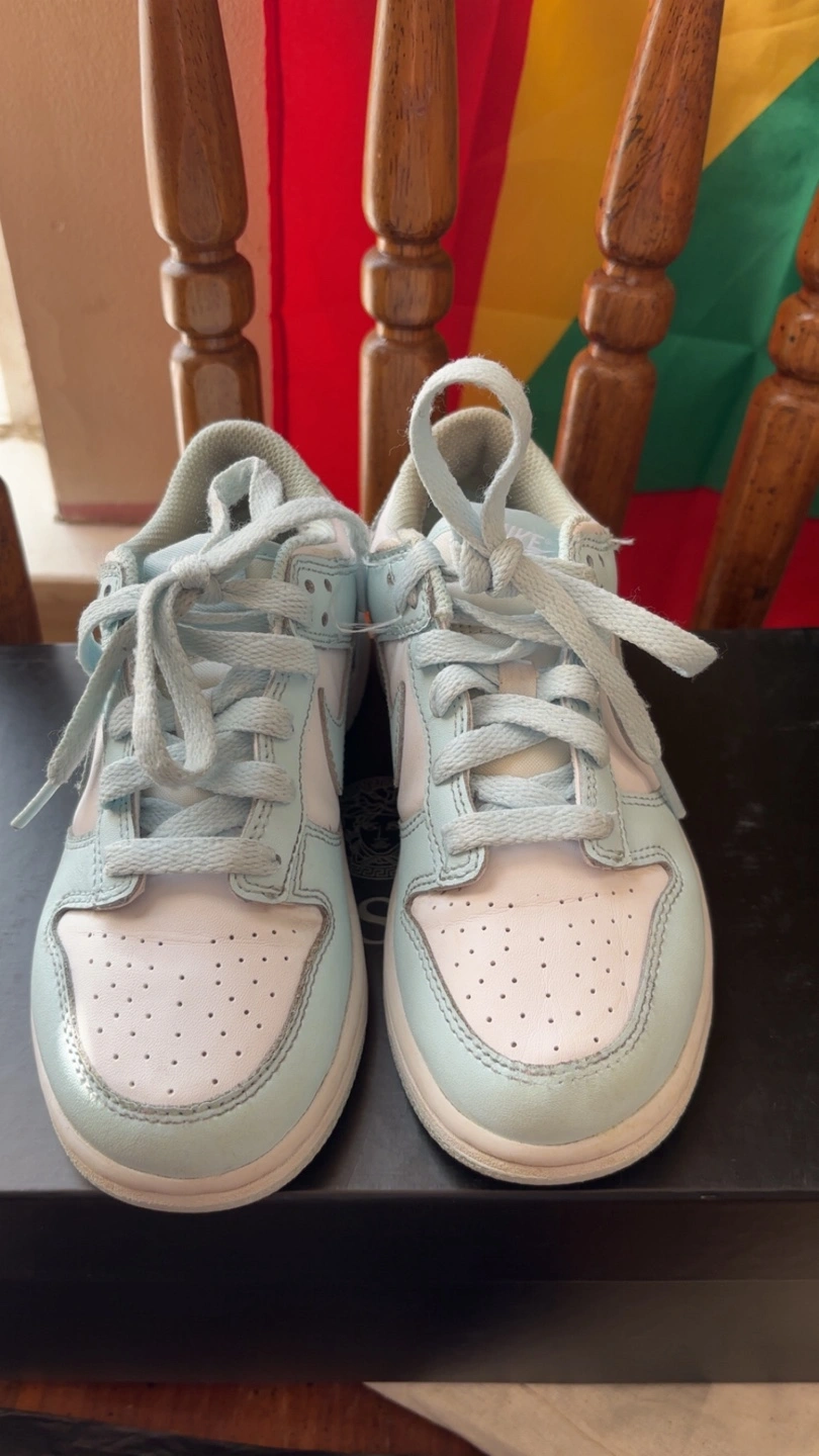 29Lightly used Nike Dunk Low sneakers. Pale blue and white colourway. Low-top style. Classic design. Good condition. Girls Nike dunks Size 1y 25$ 5$ delivery