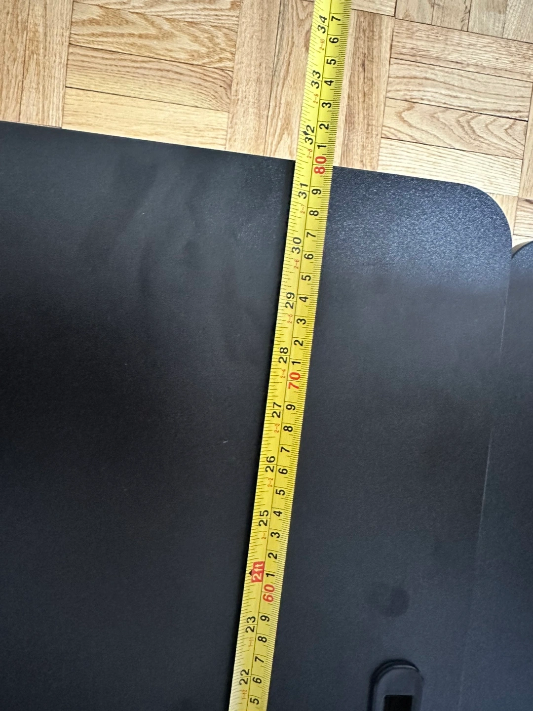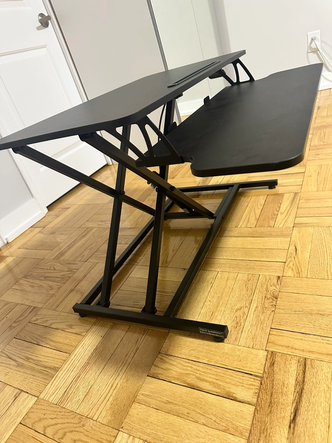 Black standing desk converter. Two-tiered design. Easy height adjustment. Great for home or office use. Compact and space-saving.
