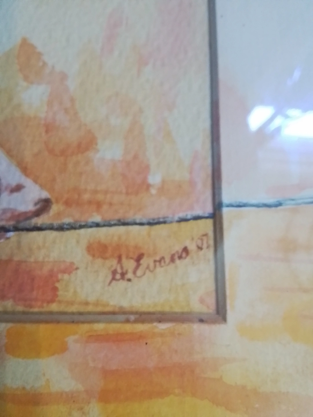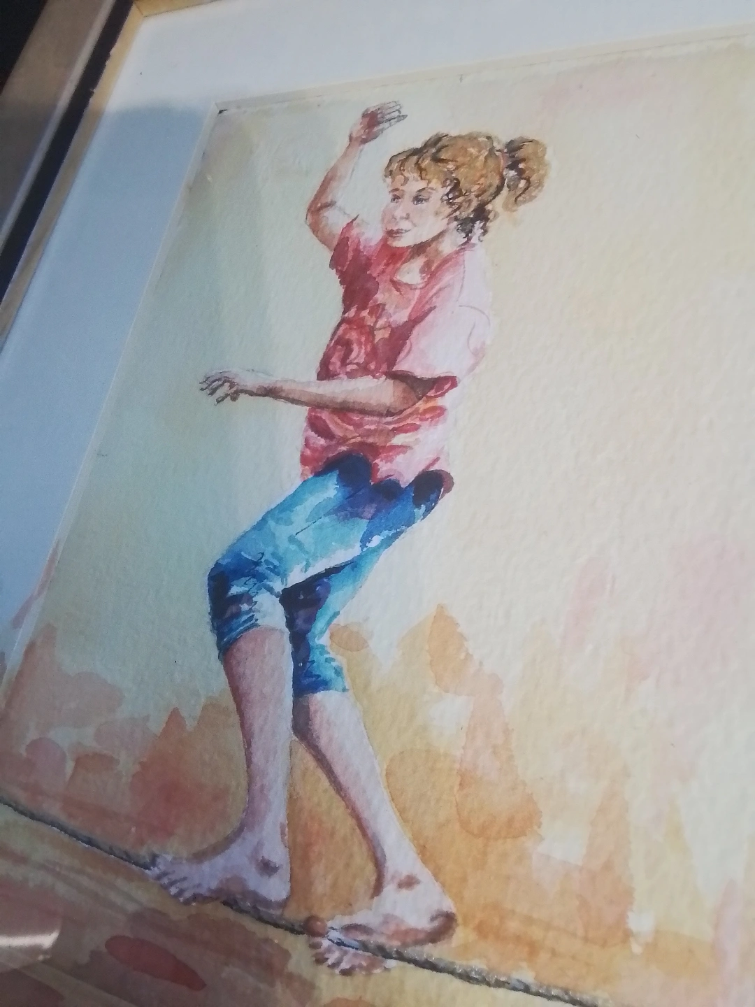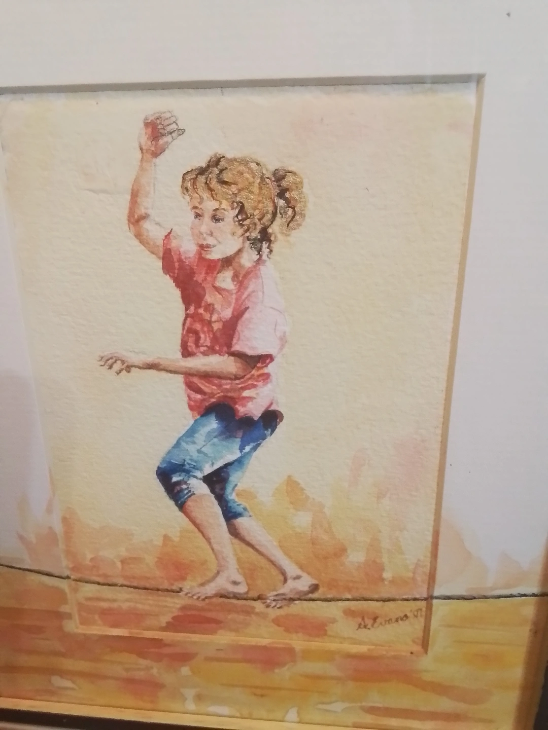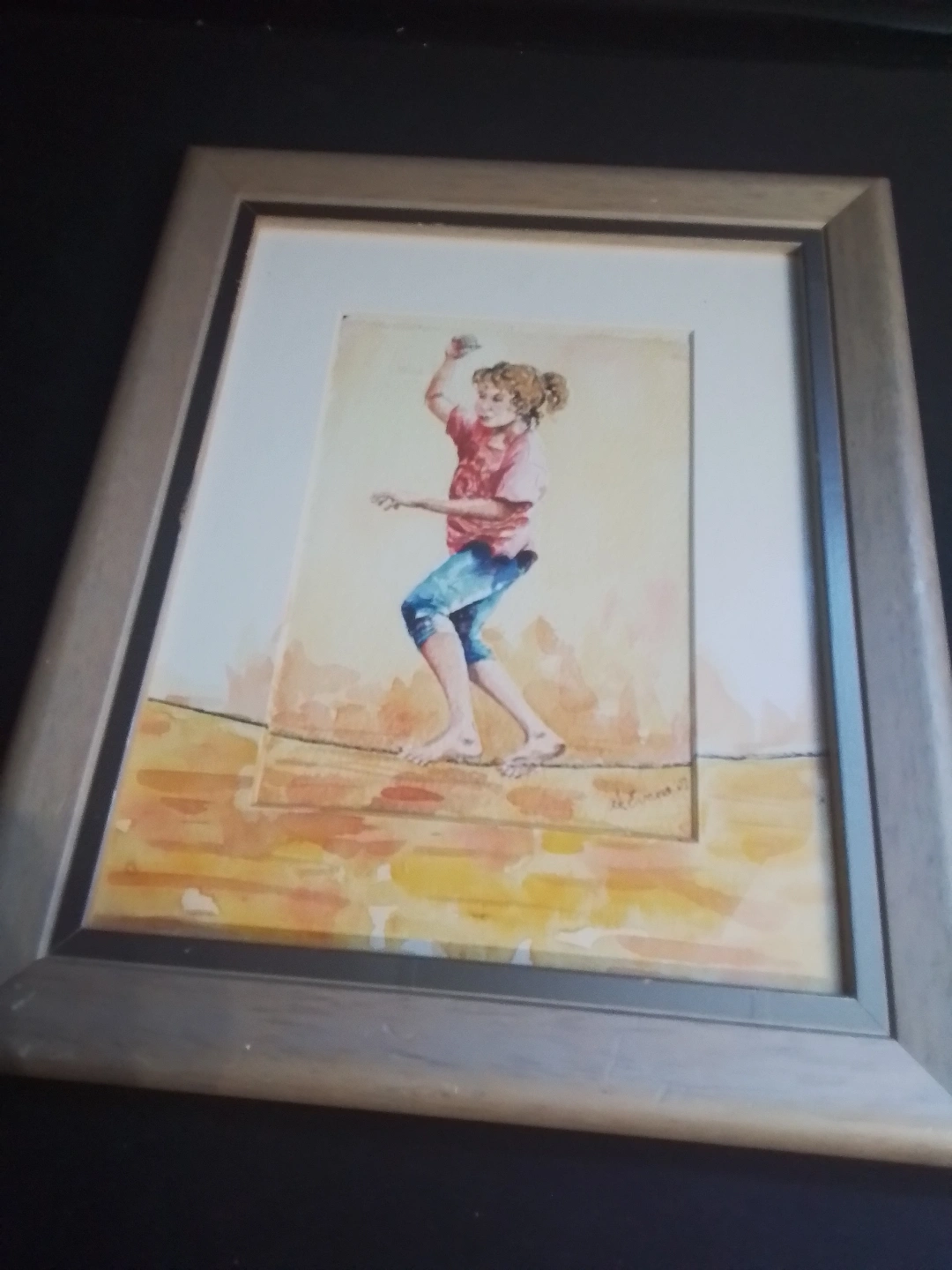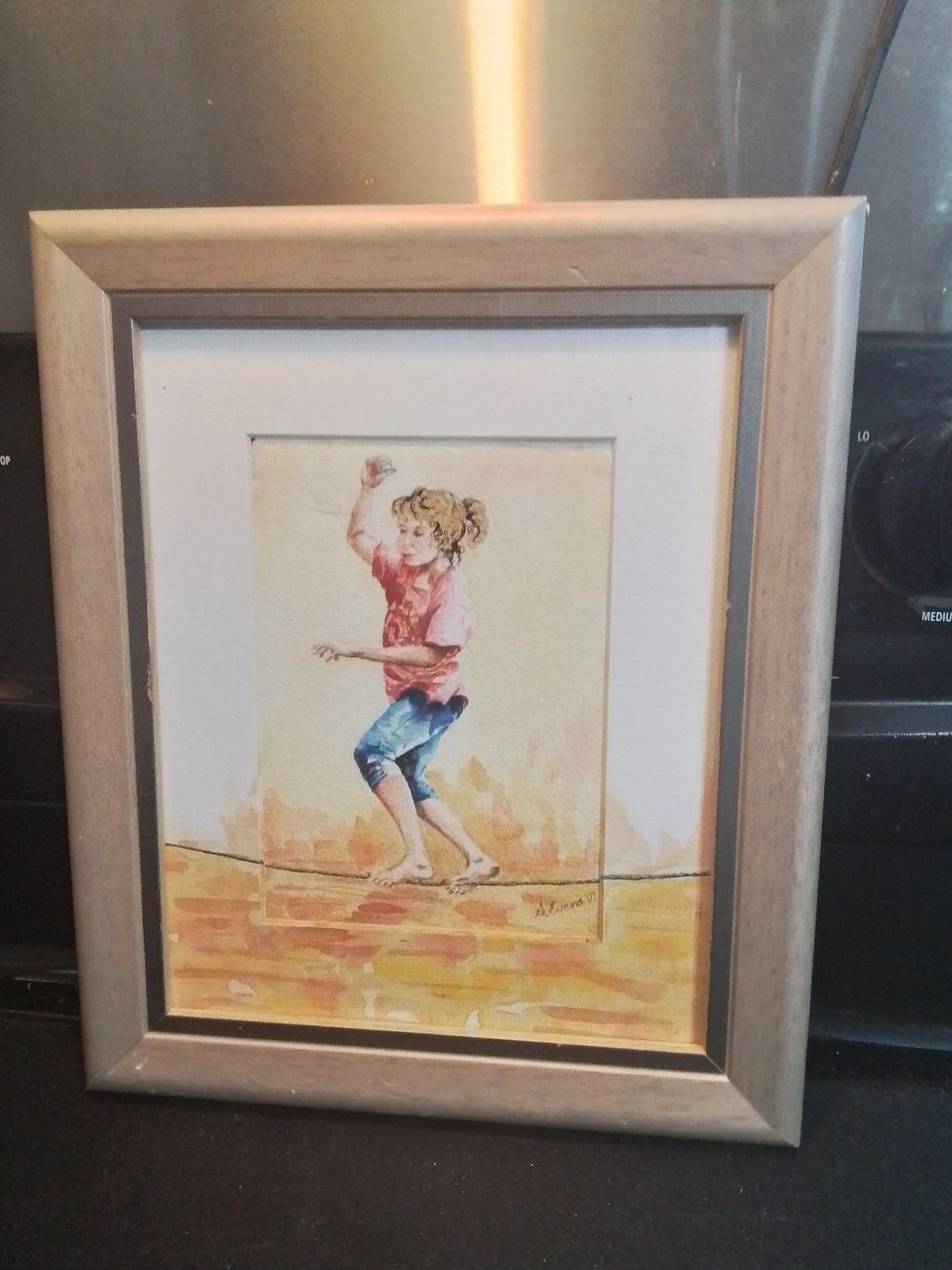 114Vintage Watercolor on Paper Signed A. Euana '07 This is a vintage watercolor painting on paper, signed by A. Euana in '07, depicting a young girl on a tightrope. It's a charming piece of art that captures a whimsical moment in time. Watercolor on paper, framed. This artwork features a delicate and detailed composition. The artwork depicts a girl balancing on a tightrope, wearing a red shirt and blue pants, set against a warm, abstract background of yellow and orange tones. Signed A. Euana '07 on bottom right corner. 17 cm x 12 cm (6 11/16" x 4 23/32"), F: 31 cm x 26 cm (12 13/64" x 10 15/64") Country of Origin: USA Estimate 150.00 - 300.00 USD This painting is a delightful addition to any art collection, adding a touch of nostalgia and artistry to your space. If the ad is up, it's still available! Pickup at Young Street and Steels Ave