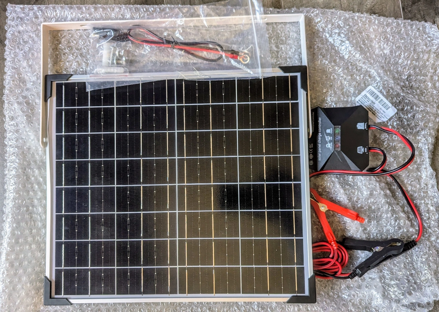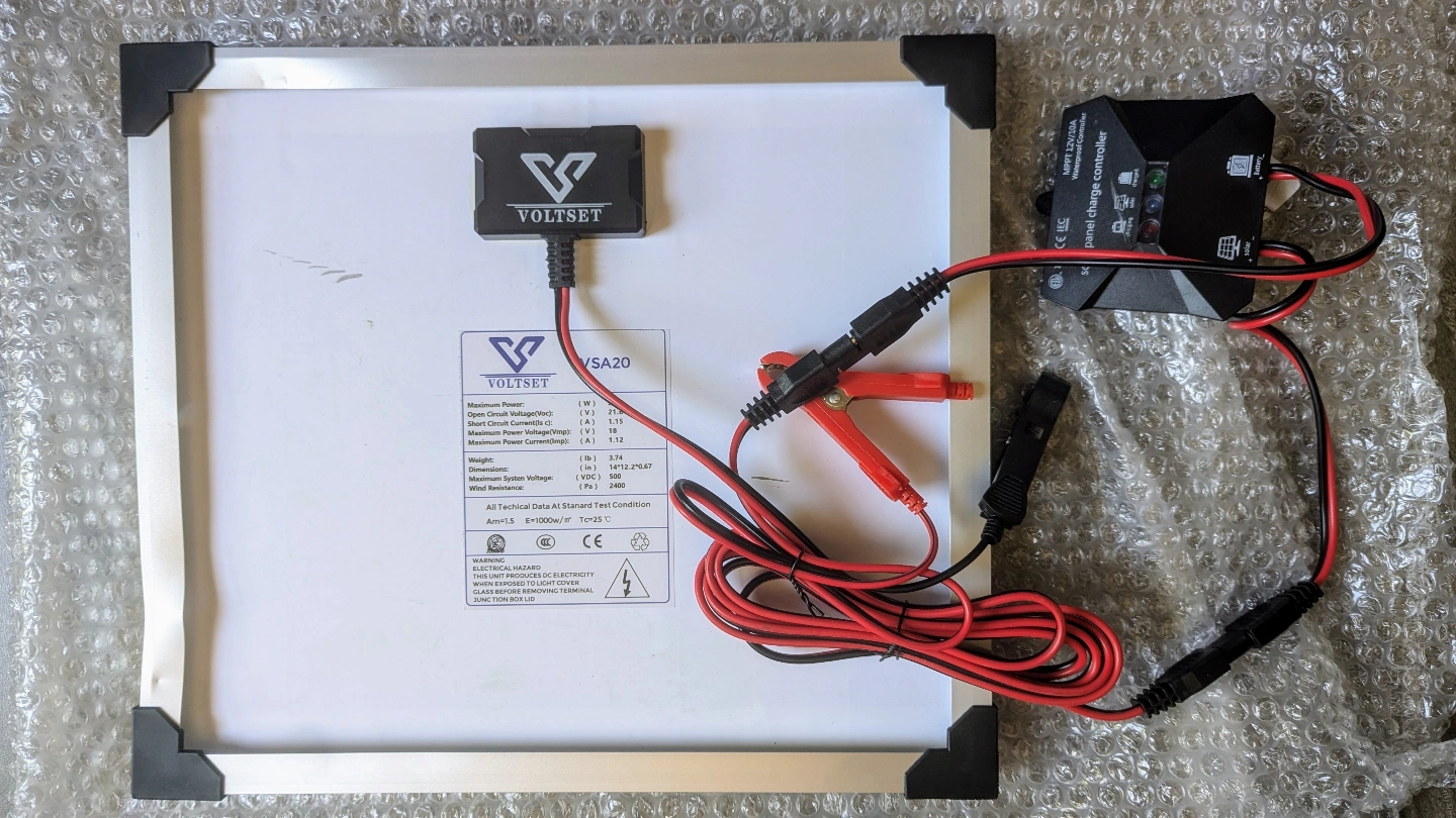 New VOLTSET 20W solar panel kit. Includes solar panel, charge controller, alligator clips, and wiring. Perfect for charging batteries or powering small devices. Portable and easy to use.