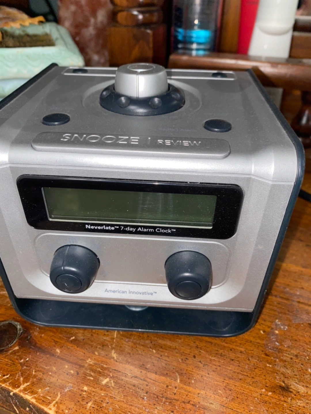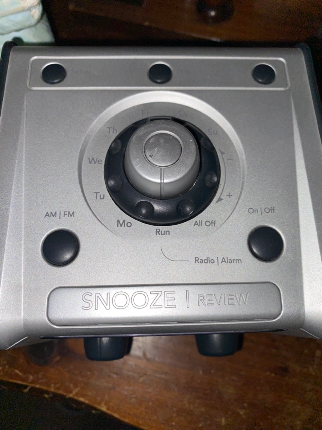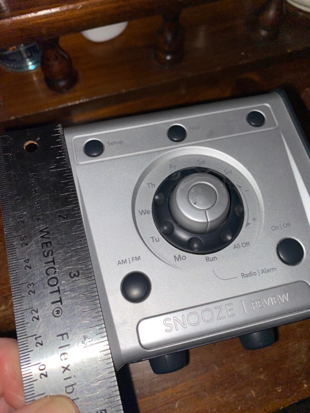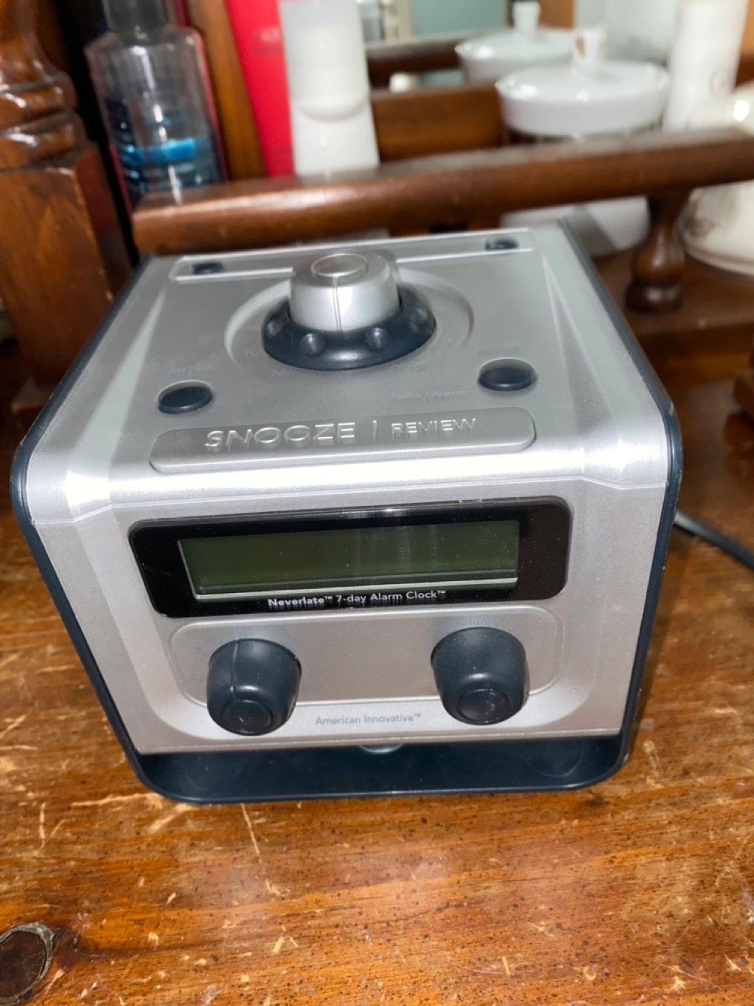 Silver alarm clock radio. Features AM/FM radio, snooze and review buttons, and a 7-day alarm setting. Uses batteries. Compact size. Vintage