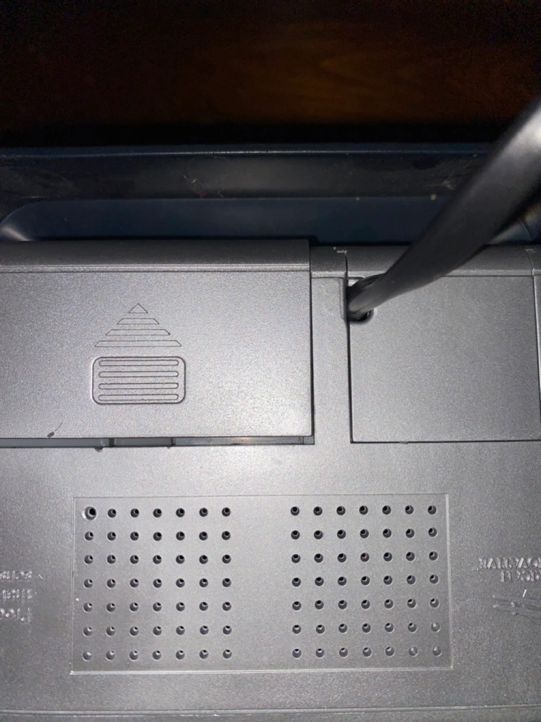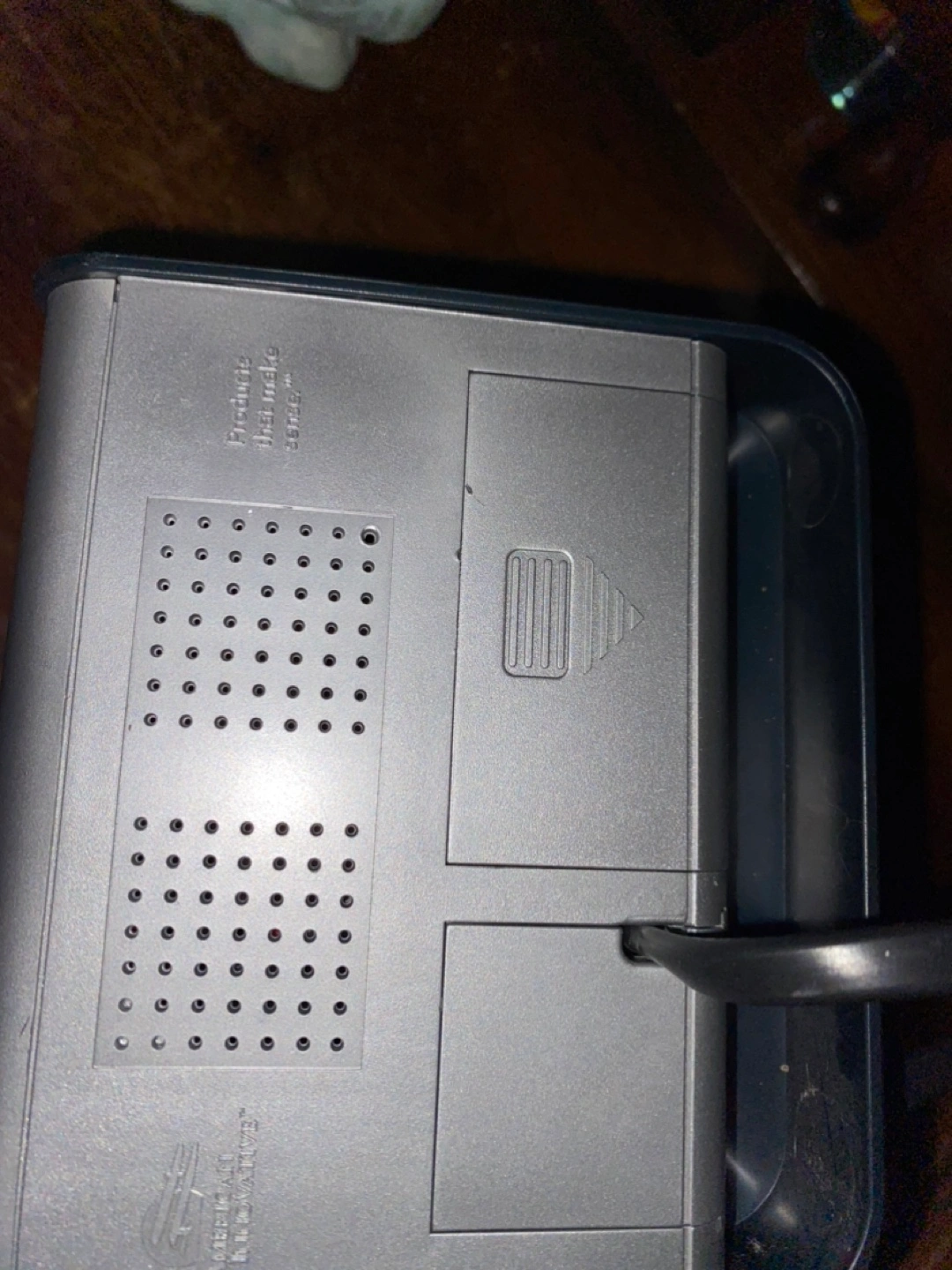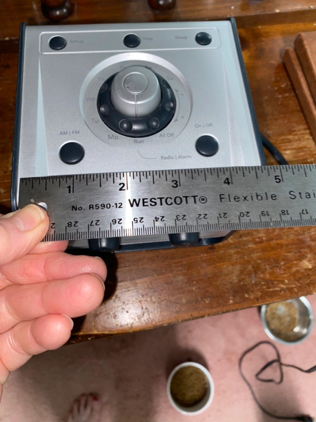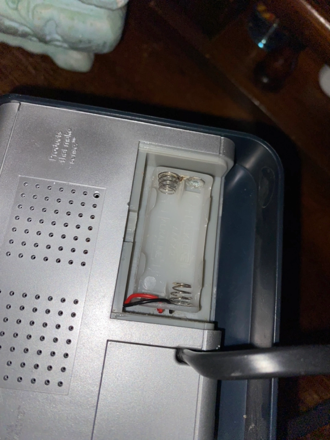 Silver alarm clock radio. Features AM/FM radio, snooze and review buttons, and a 7-day alarm setting. Uses batteries. Compact size. Vintage