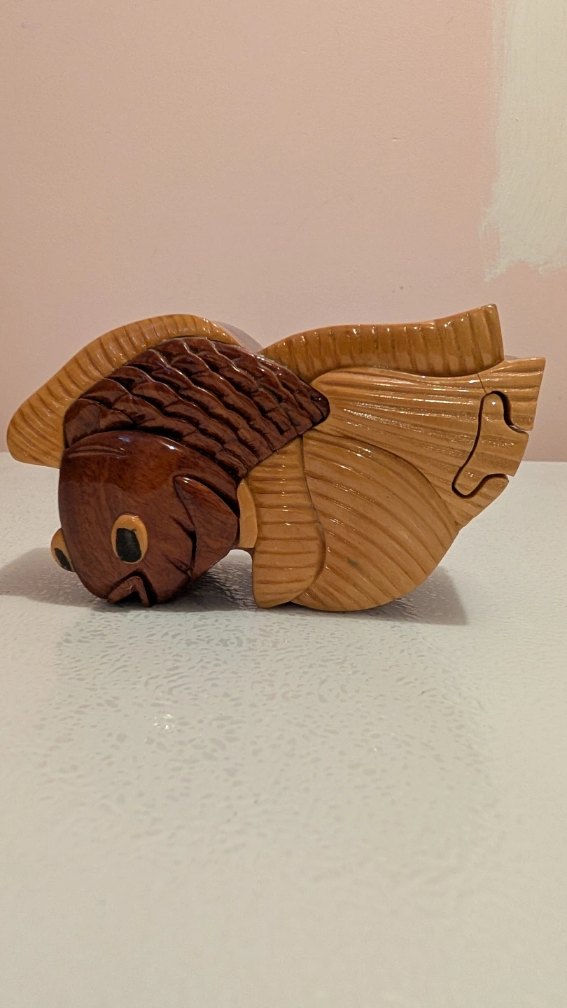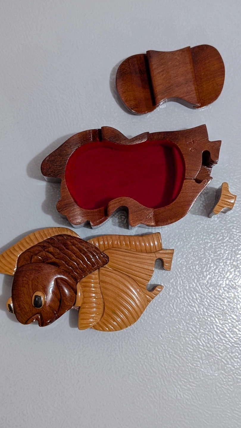 Unique handcrafted wooden puzzle box. Shaped like a fish. Features multiple interlocking pieces. Red velvet interior. Great gift or collectible.