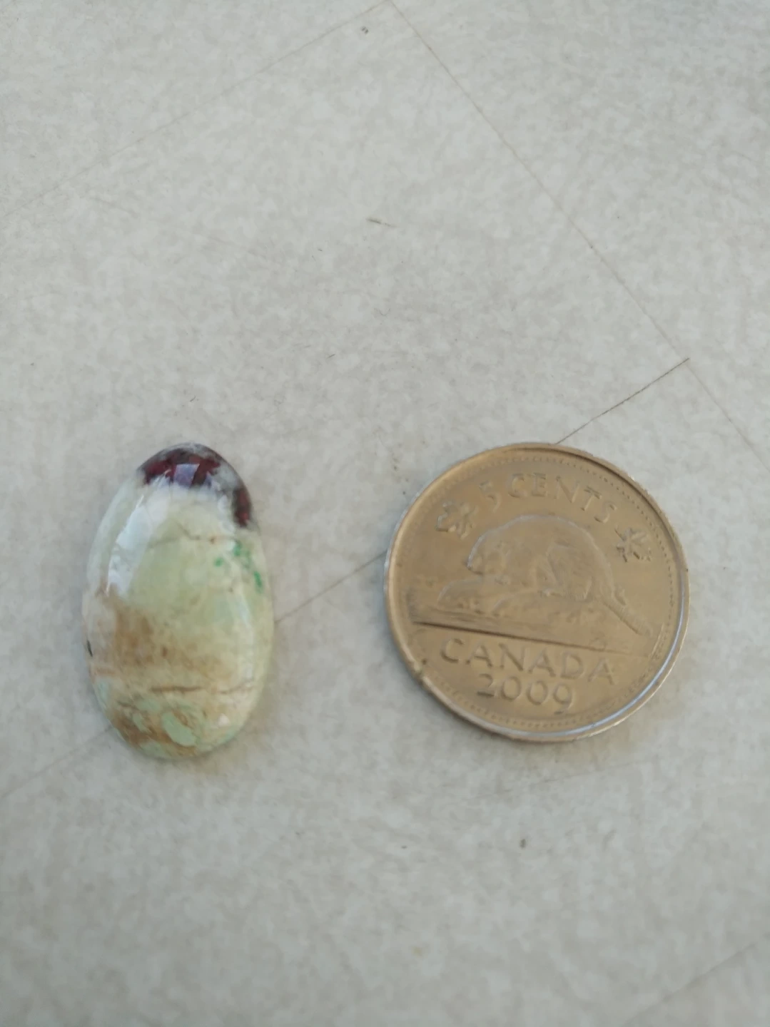 Beautiful rare Campbellite, found only in Arizona. Oval shape. Green, brown, and red tones. Size shown with a nickel. Ready for jewellery setting.