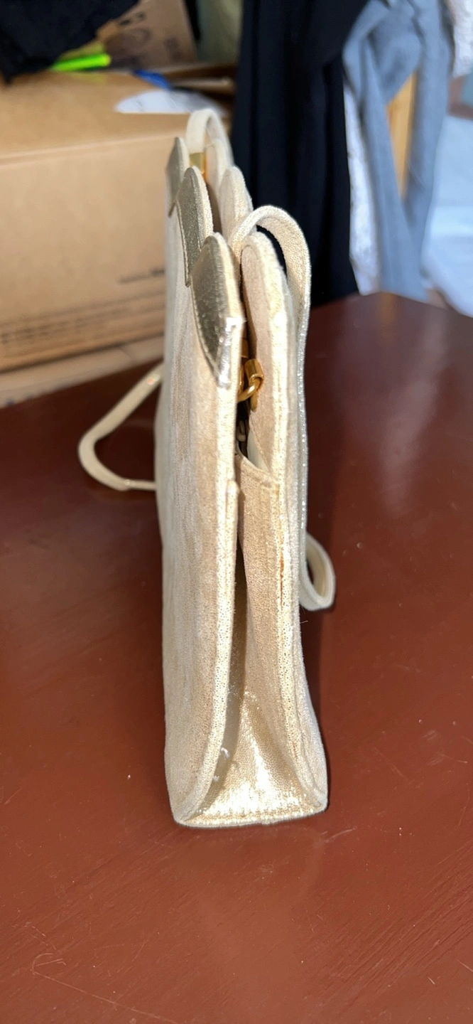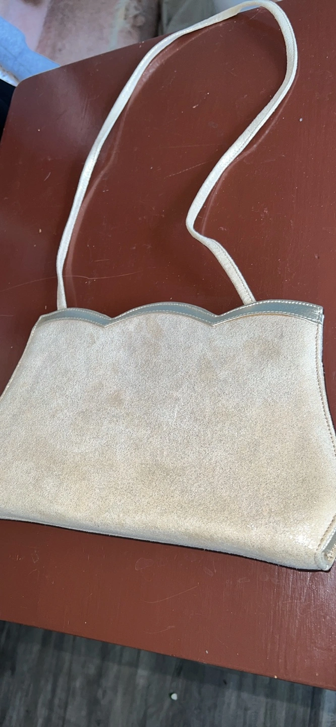 Beautiful vintage handbag. Scalloped detailing. Light beige suede-like material. Gold-toned hardware. Interior zipper pocket. Shoulder strap.