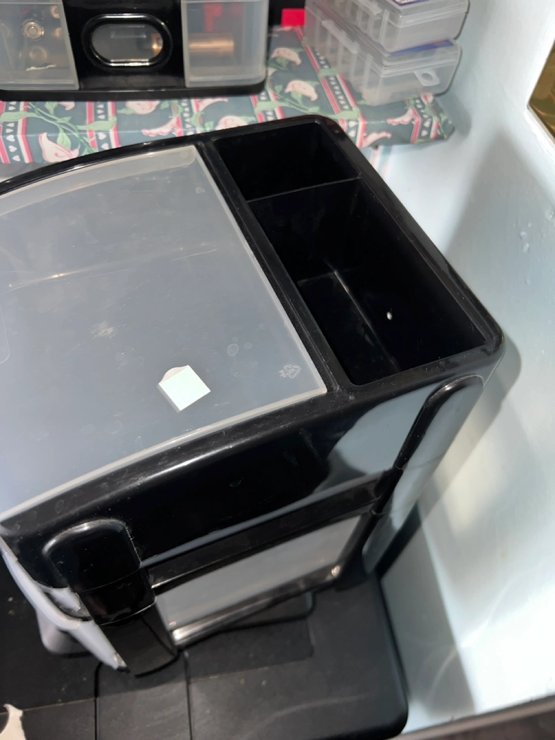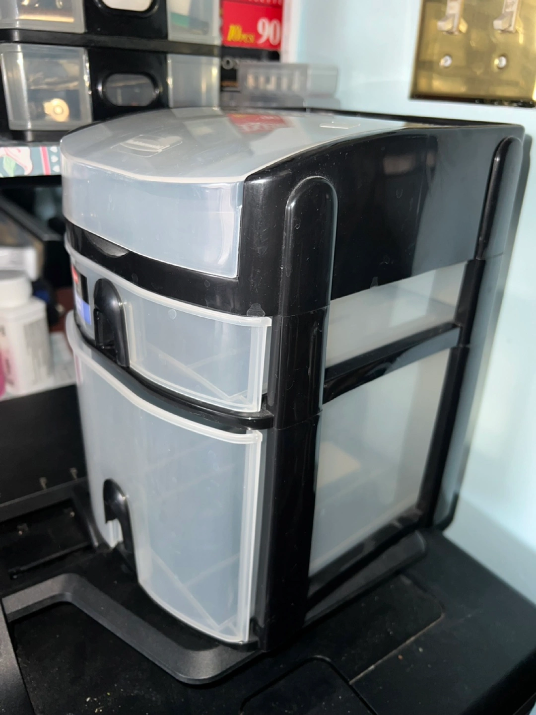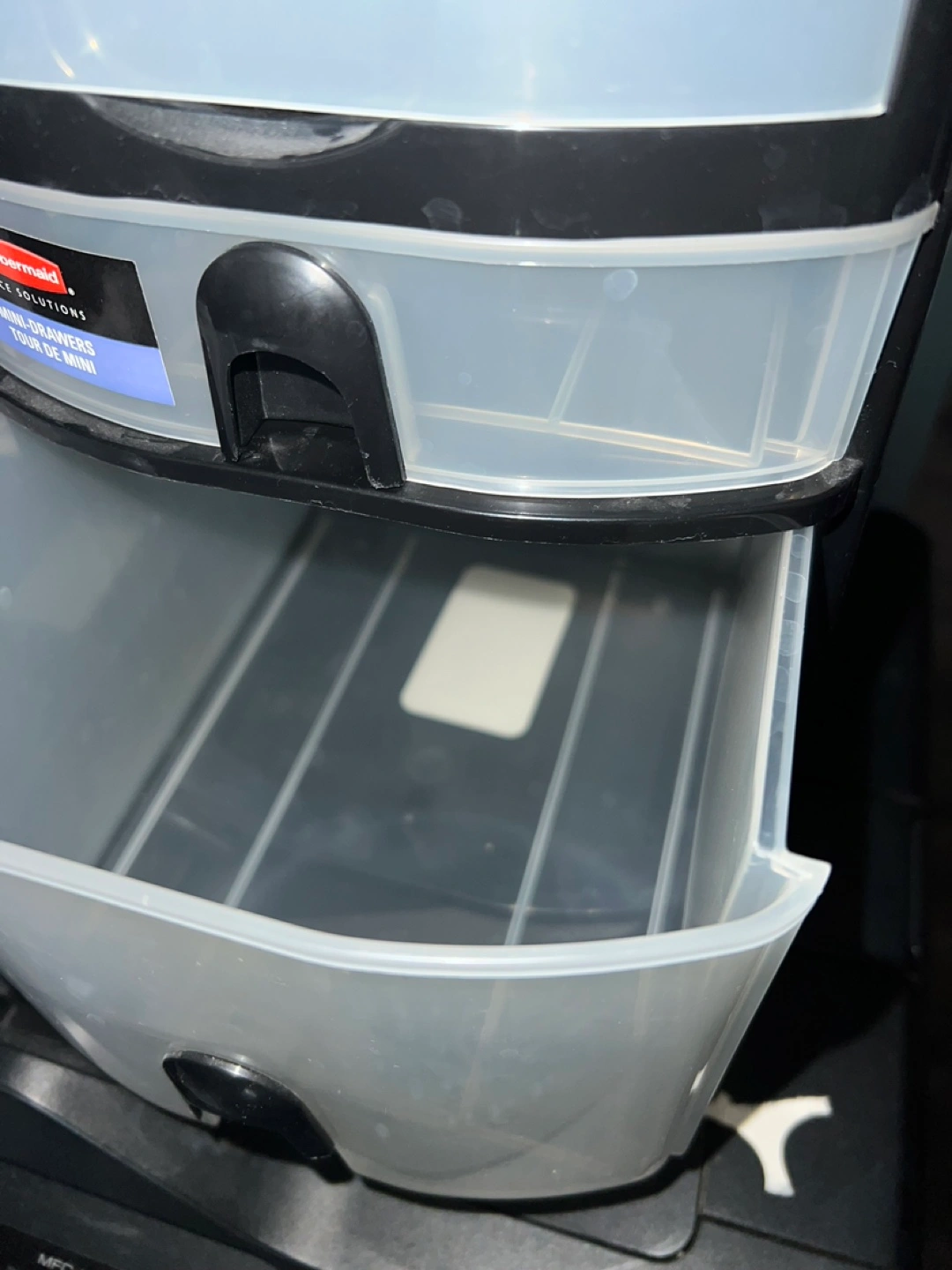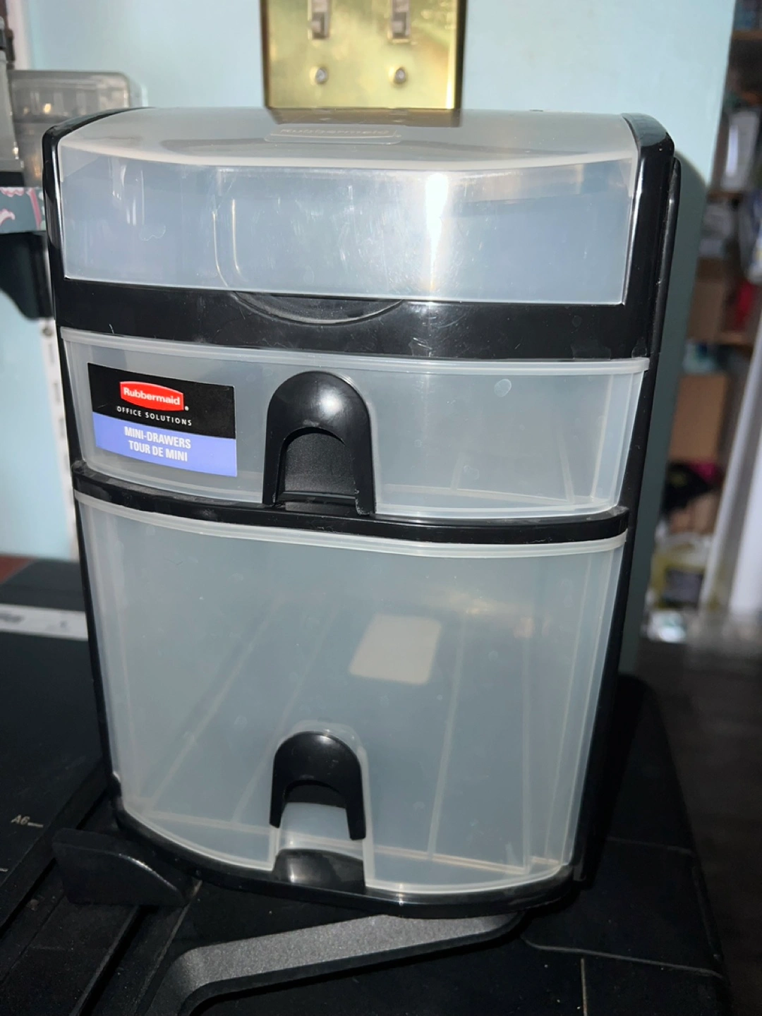 Two-tiered mini drawer organizer. Black and clear plastic construction. Great for organizing small items. Approximately 8 inches tall.