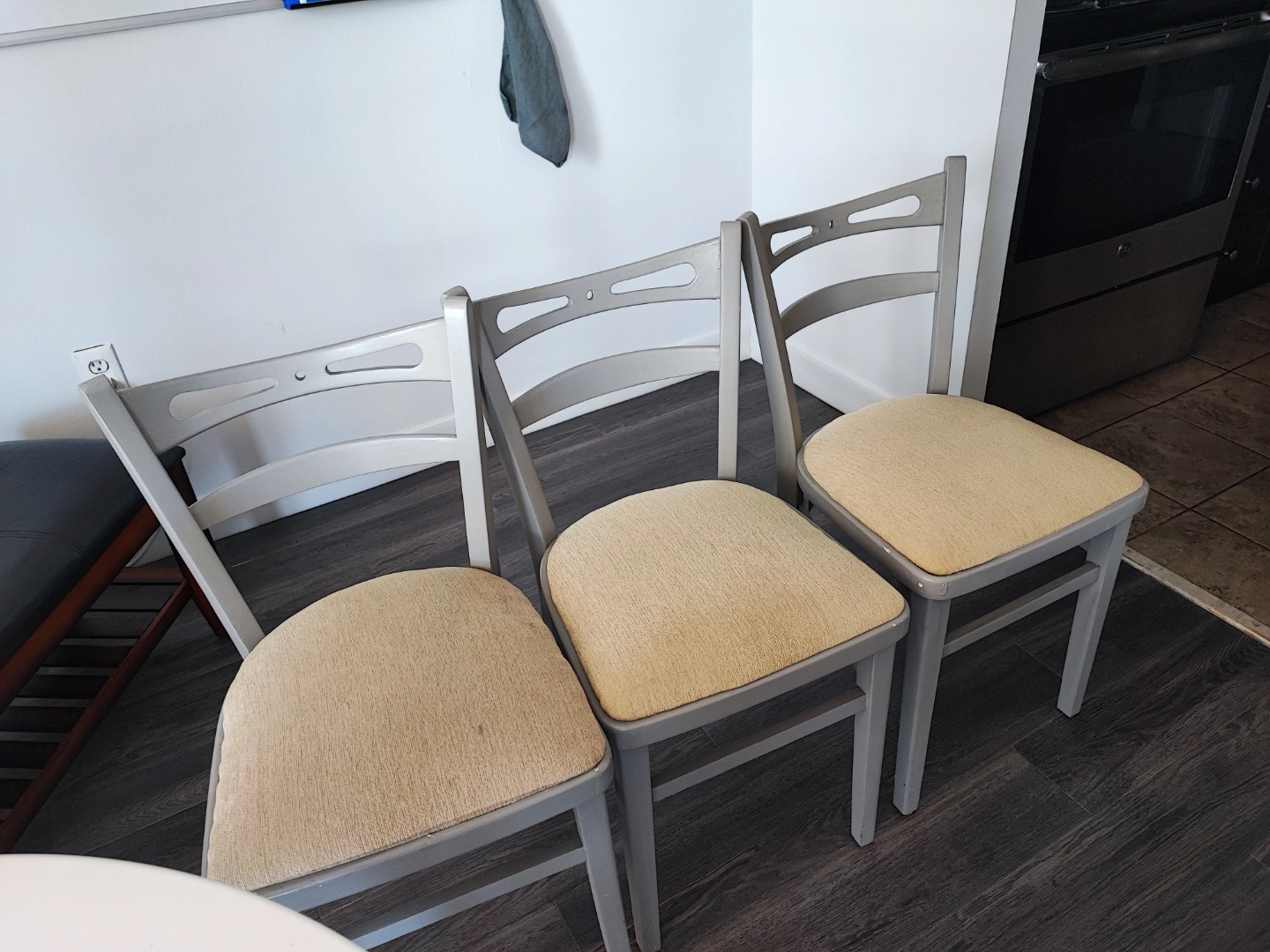 Four grey painted dining chairs. Beige cushioned seats. (4th one is in my storage room, I only use 3 as I don't live with a lot of people)