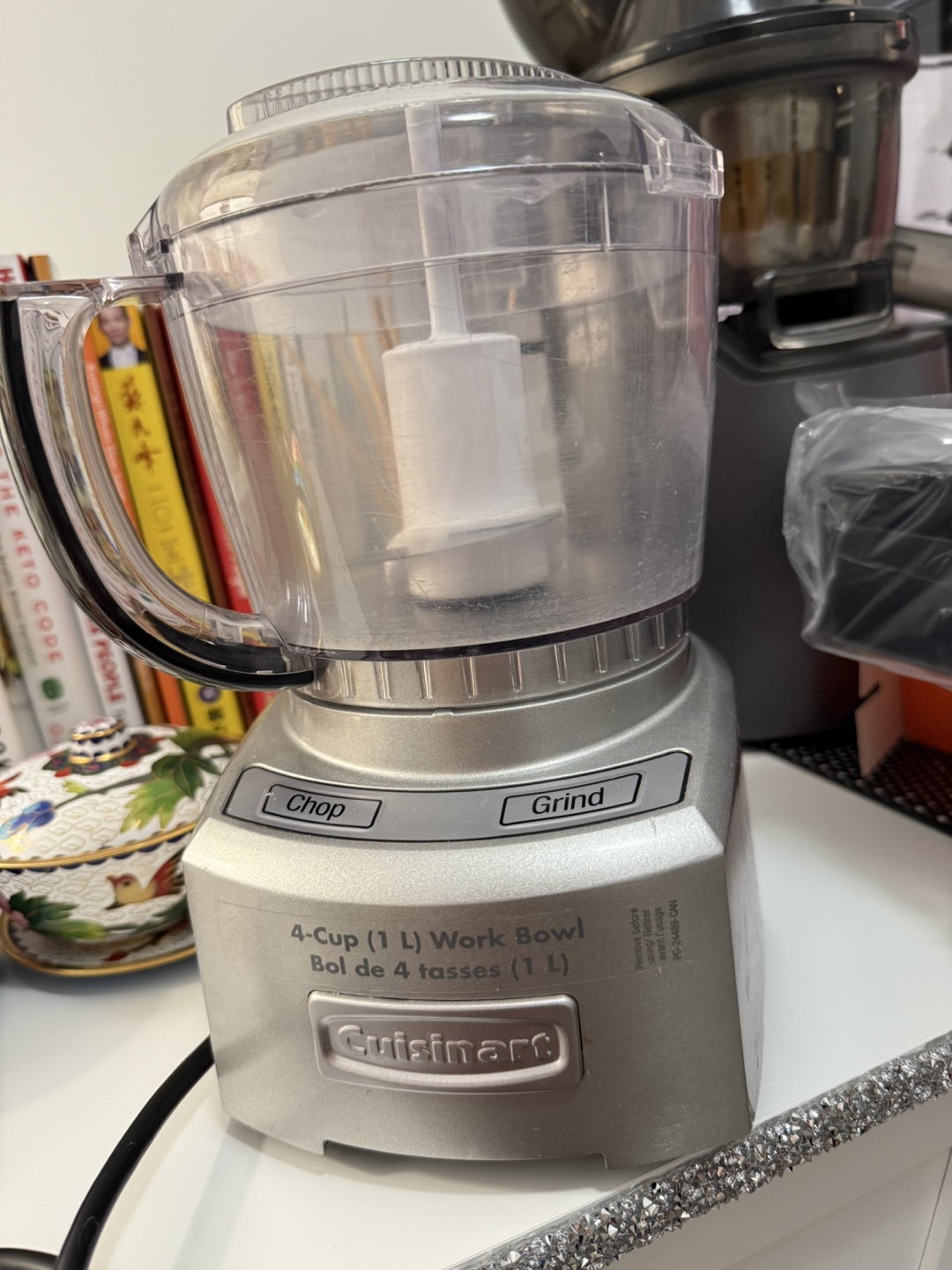 Mini food processor. Features chop and grind functions. Includes a 4-cup (1L) work bowl. Silver coloured.