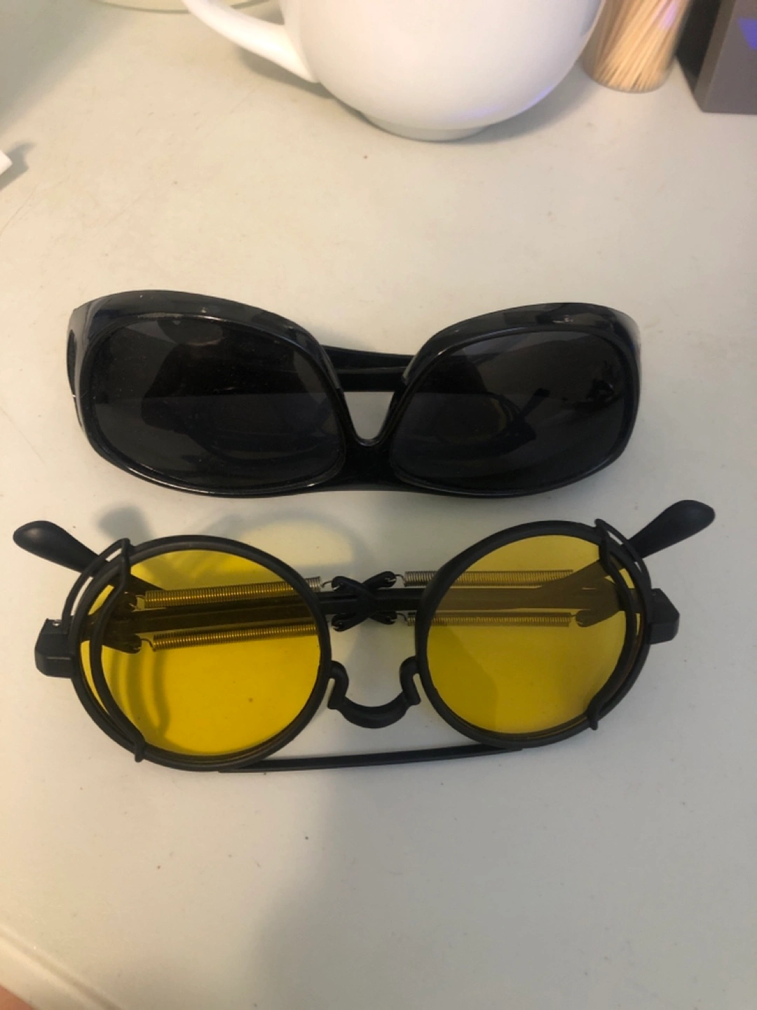 Two pairs of sunglasses for sale. One pair has black frames and dark lenses. The other pair has round yellow lenses and black metal frames. Both in good condition.