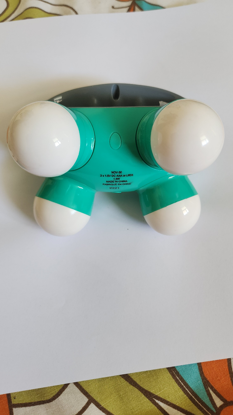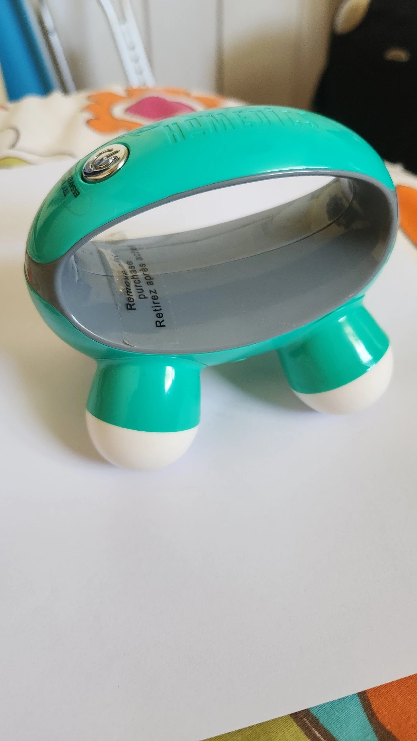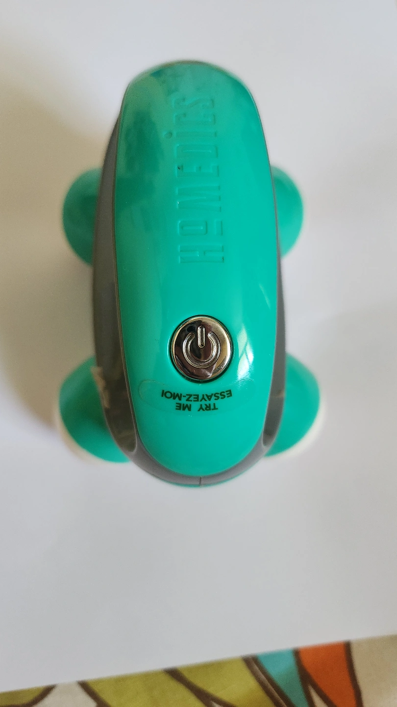 Teal and grey handheld massager. Features four massage balls. Battery operated. Compact and portable.