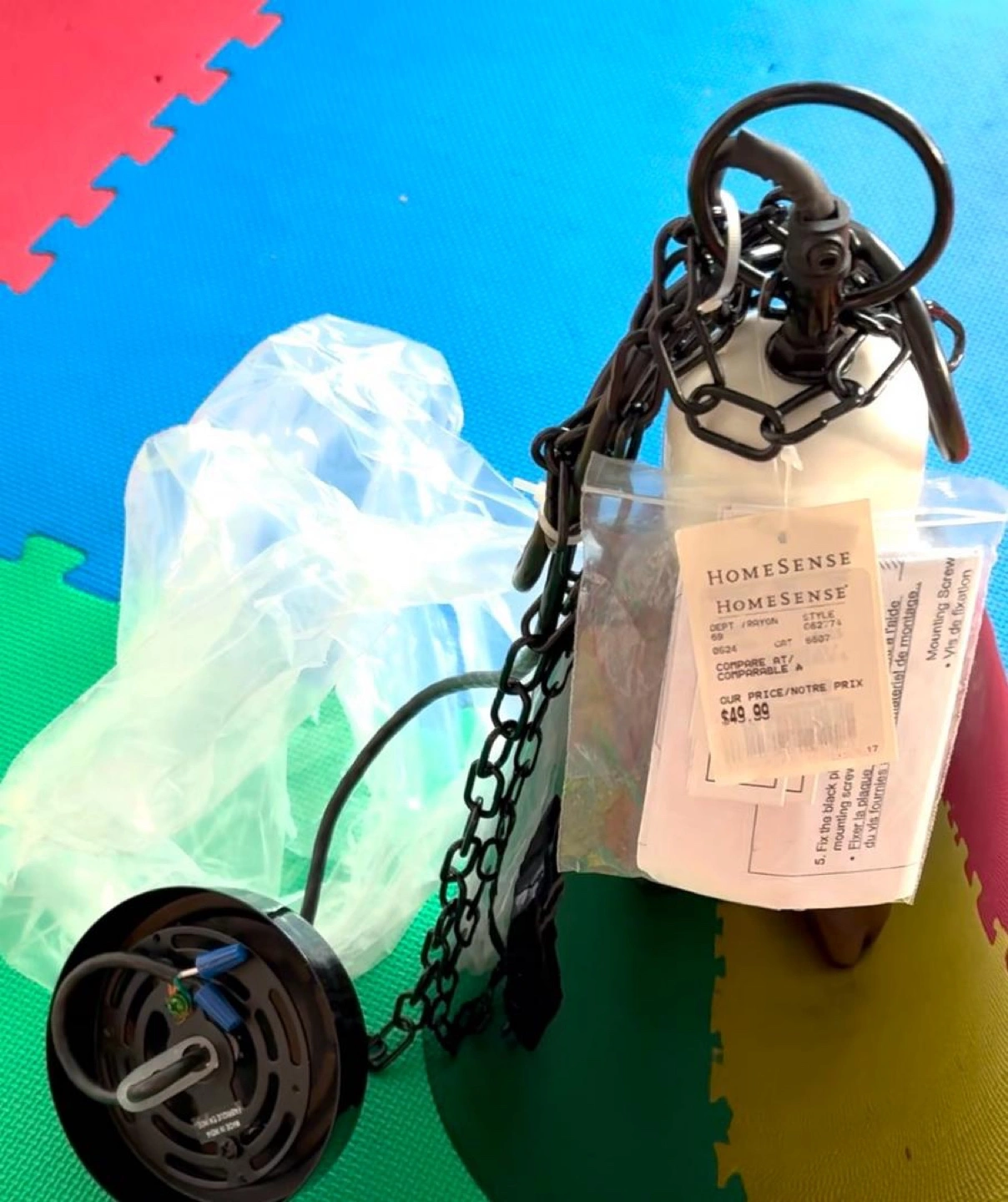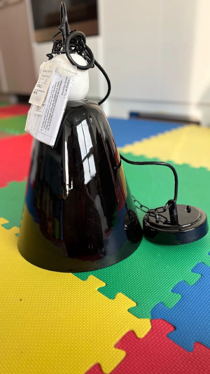Black pendant light. Cone-shaped shade. Metal chain and ceiling rose. Easy installation. Brand new, never used.