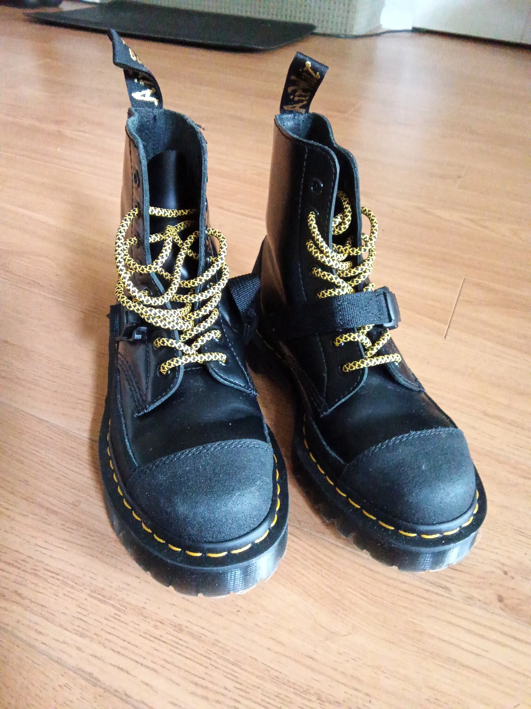 New black Dr. Martens boots. Yellow laces. Unique buckle detail. Durable construction. Classic style. Real leather. Made in England. Only tried on indoors. I prefer Chelsea style so these have never been worn. Label says size 6 but fits here as size 8 women's.
