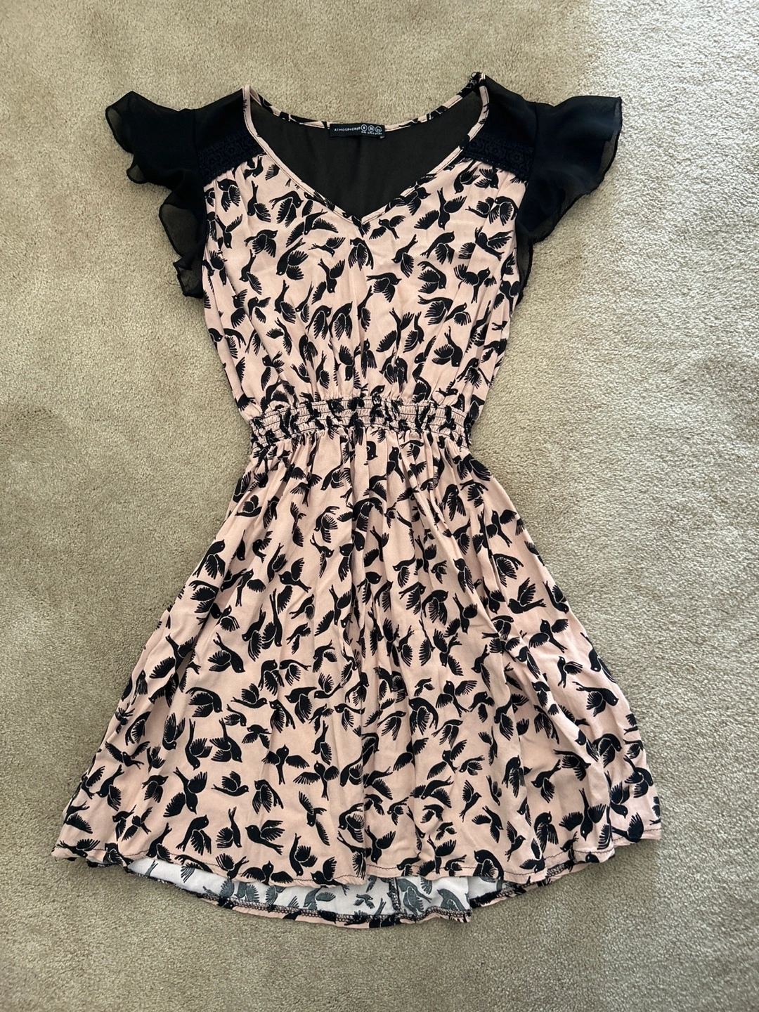 Cute summer dress. Features a pink bird print, black sheer sleeves, and elastic waist. V-neck design. Great for a casual day out.