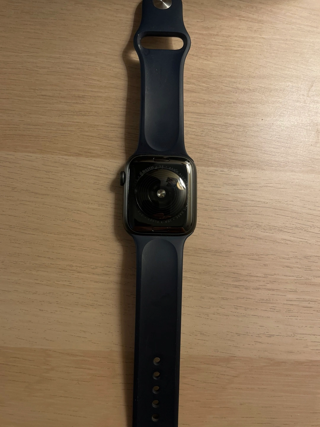 Apple Watch Series SE. 44mm case. Midnight blue colour sport band. Space grey aluminium. sport band.