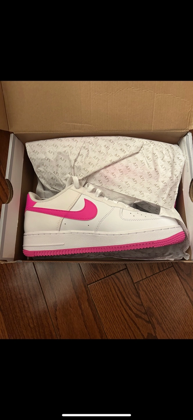 Women's shoe, size not specified. White leather upper, hot pink accents. New in box. Size 7 youth