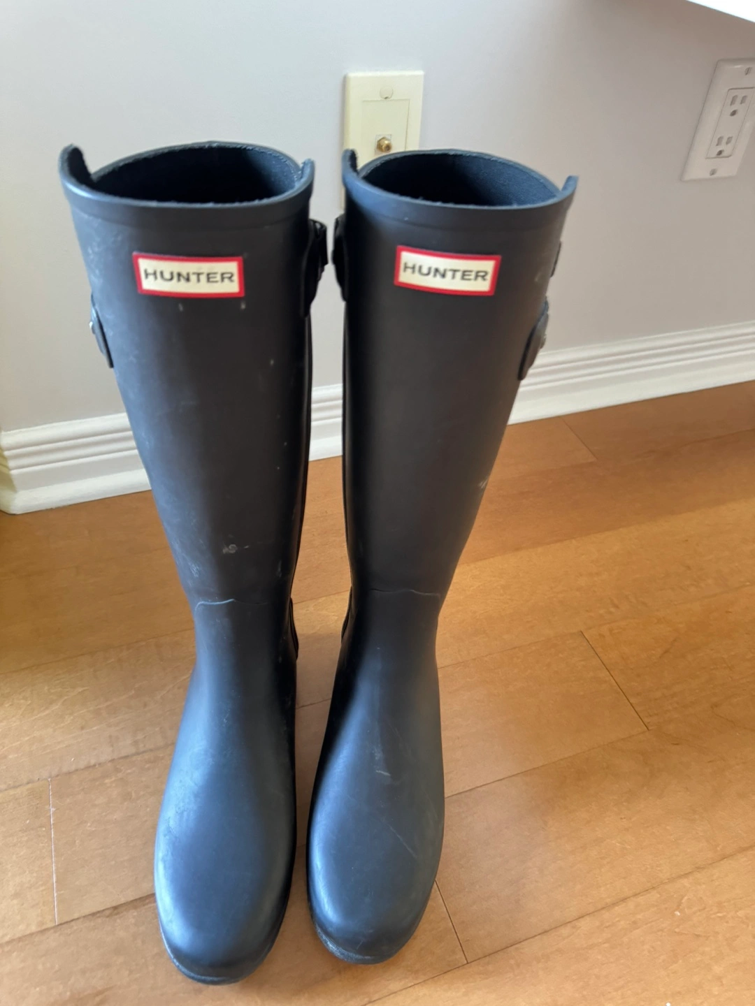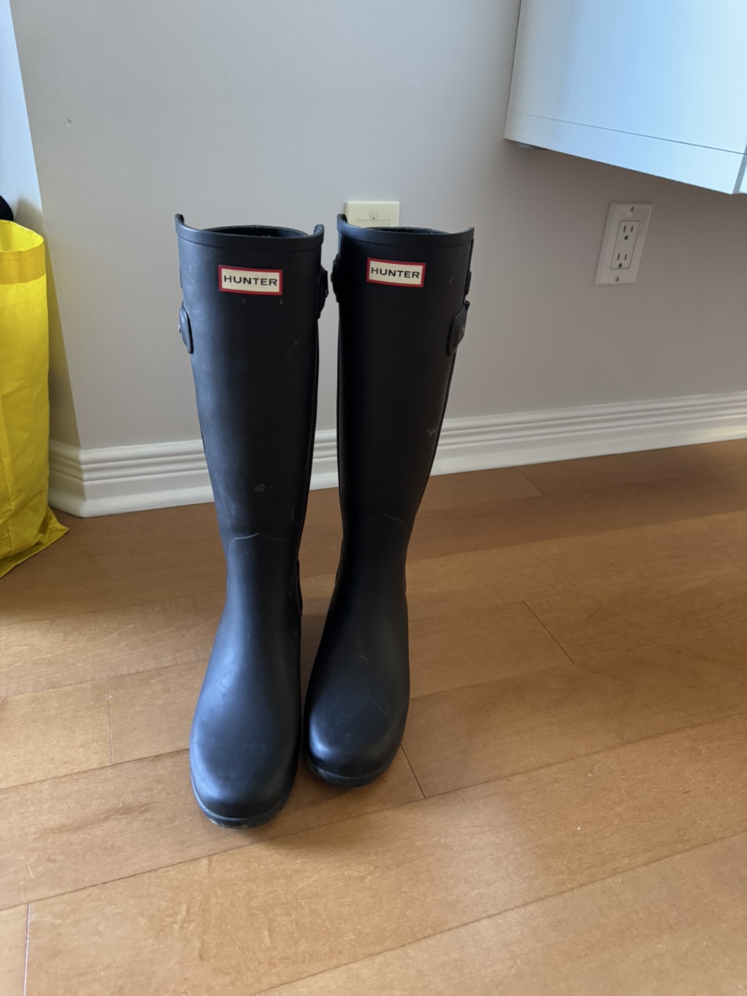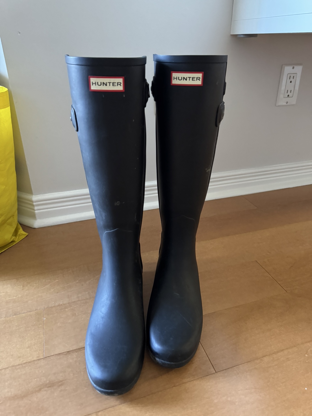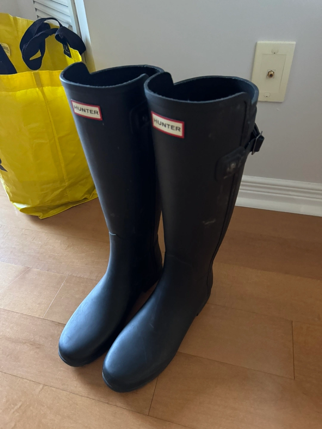 Pair of black Hunter boots. Women's size US 9, UK 7, EU 40/41. Refined tall style.