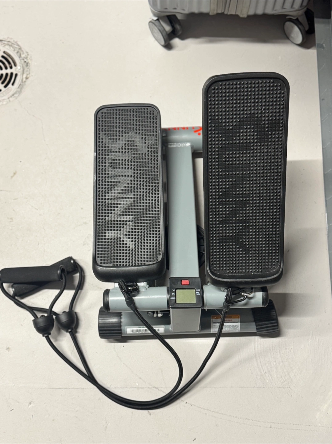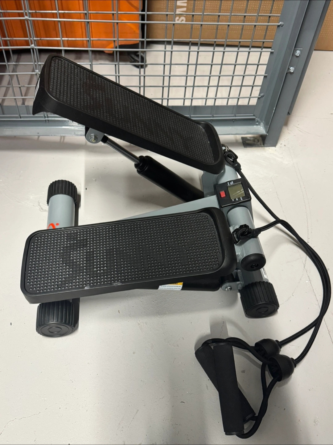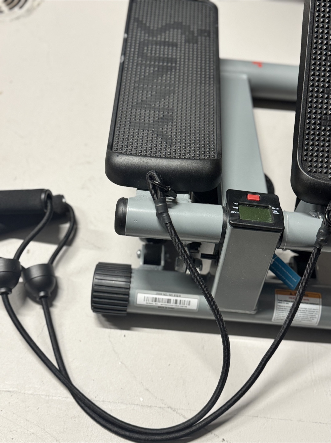 Portable mini stepper. Great for home workouts. Includes resistance bands. Digital monitor tracks steps, time, and calories.