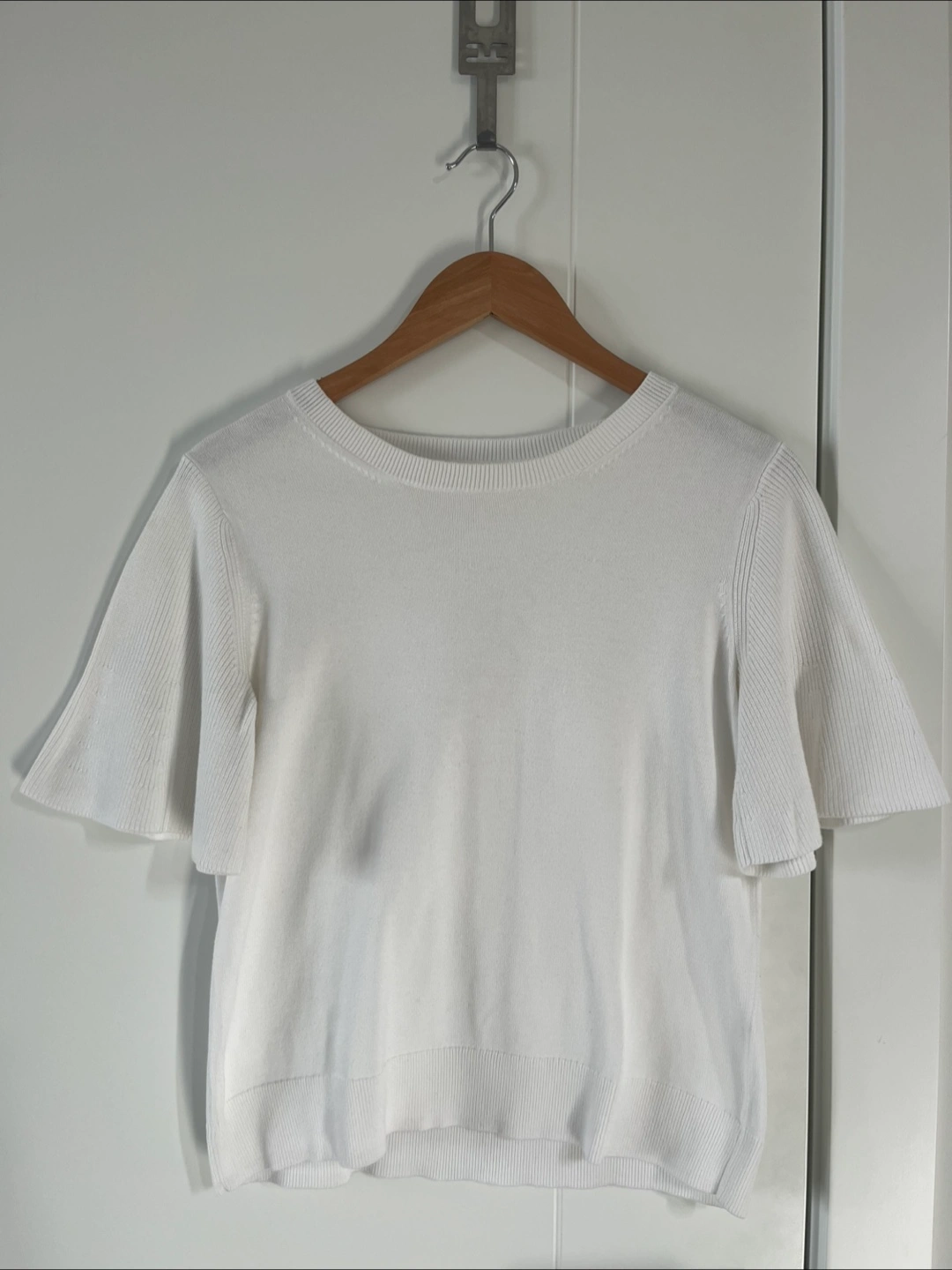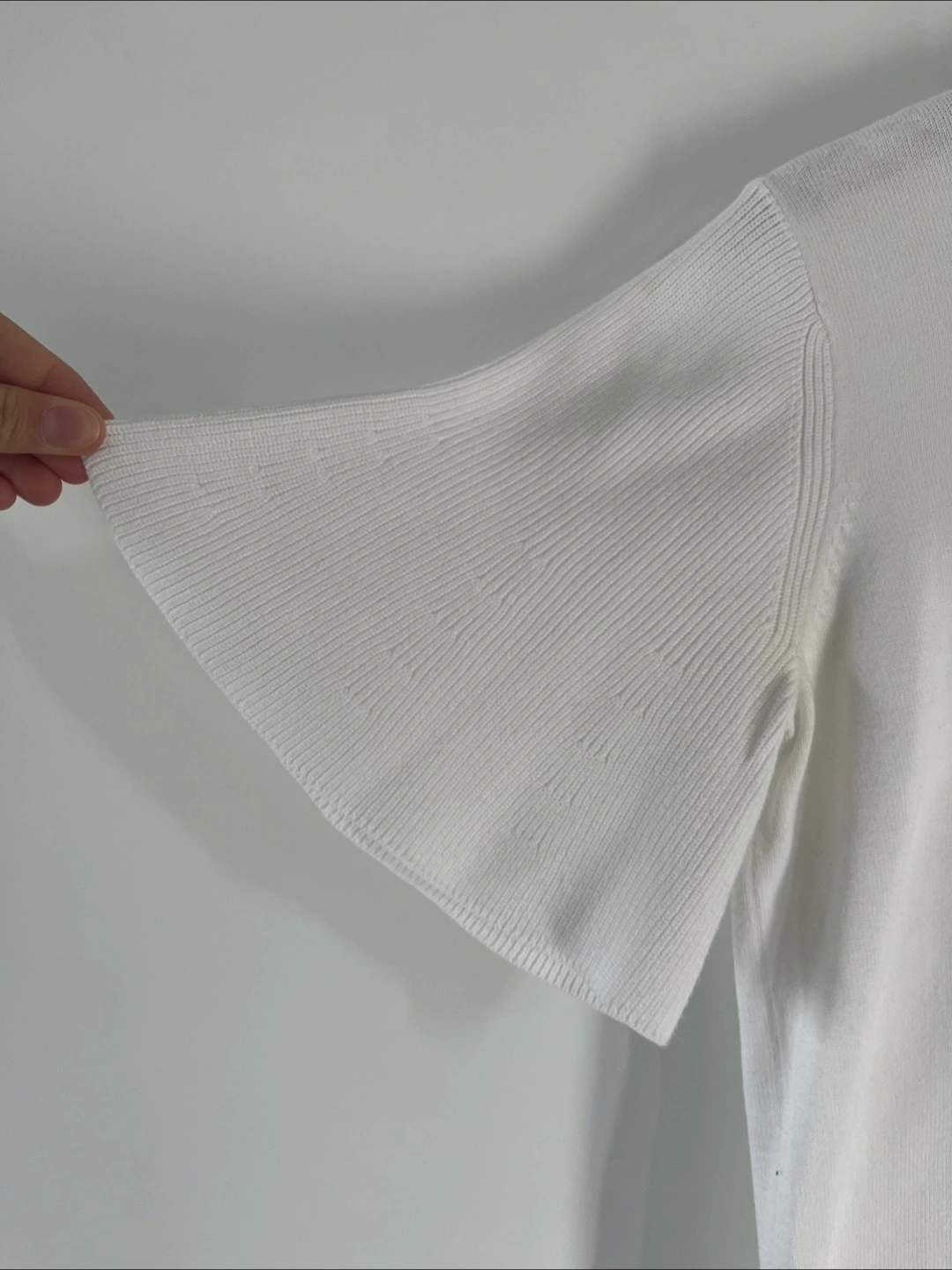 Adorable white cropped knit sweater. Features bell sleeves and ribbed detailing. Soft and comfortable material. Perfect for spring or summer. Tag is cut but fits XS-S