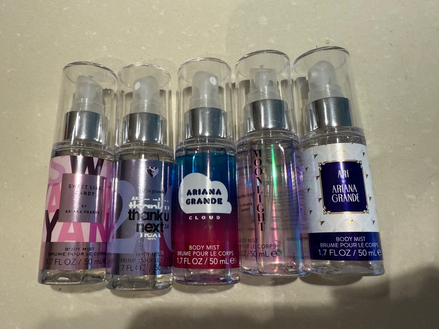 Ariana Grande body mists. Includes Sweet Like Candy, Thank U, Next, Cloud, Moonlight, and Ari. Each bottle is 1.7 fl oz/50 mL.
