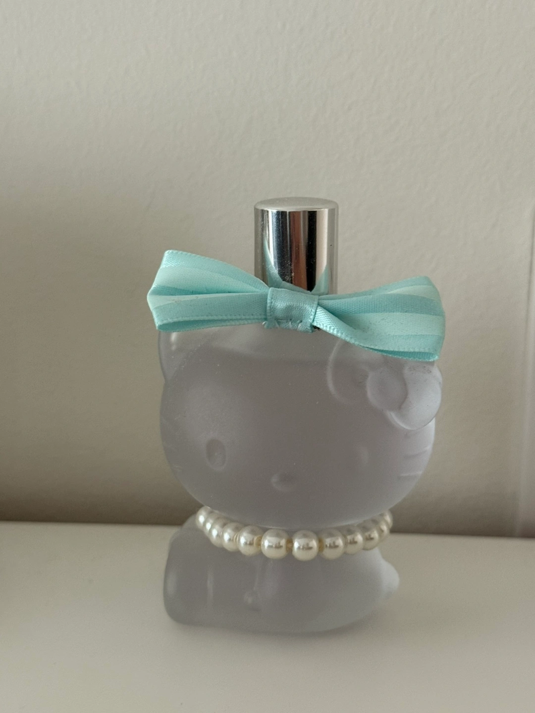Adorable Hello Kitty shaped perfume bottle. Features a light blue ribbon and pearl necklace. Frosted glass. Sprayed like twice only.