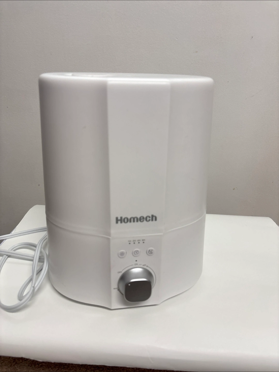 Ultrasonic cool mist humidifier. White. Features multiple settings. Perfect for dry climates.