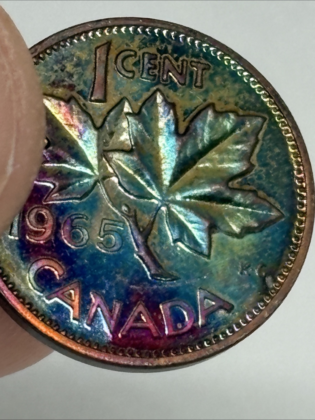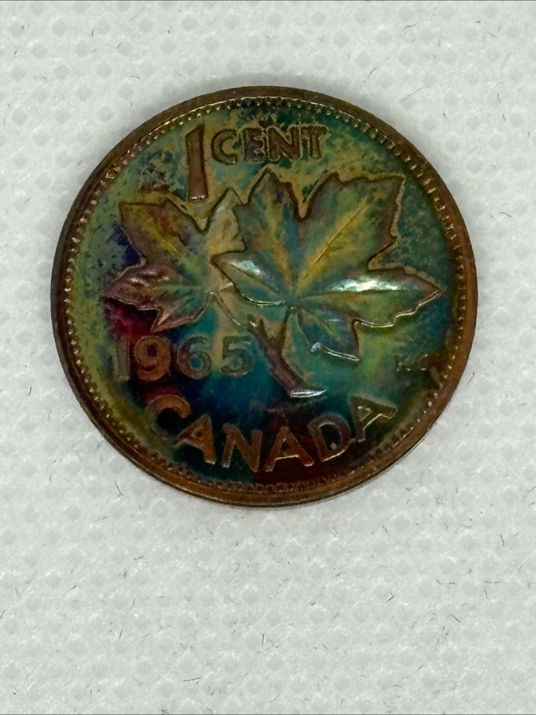 1965 Canadian one-cent coin. Shows rainbow toning. Queen Elizabeth II on the obverse. Maple leaf on the reverse. Collectible. I can’t describe the toning/colors on this coin. It’s a one of a kind for sure. It’s so beautiful. Pictures do not do justice.