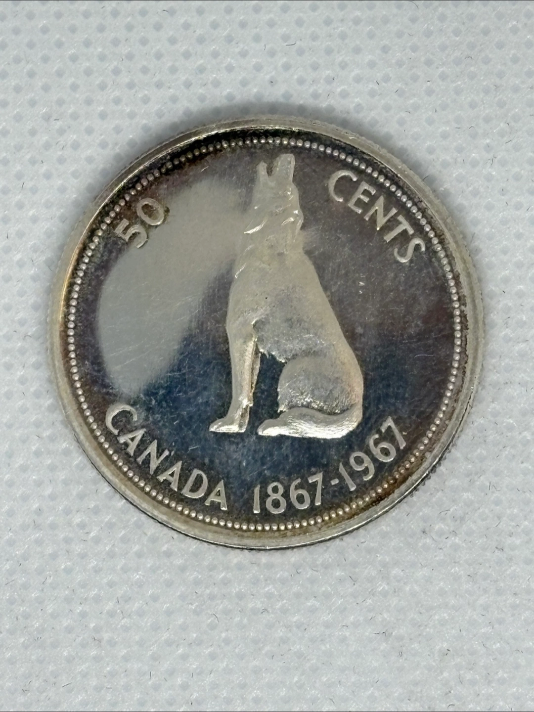 118Silver commemorative 50 cent coin. Features Queen Elizabeth II on one side and a wolf on the other. Celebrates Canada's centennial 1867-1967. Great for collectors.
