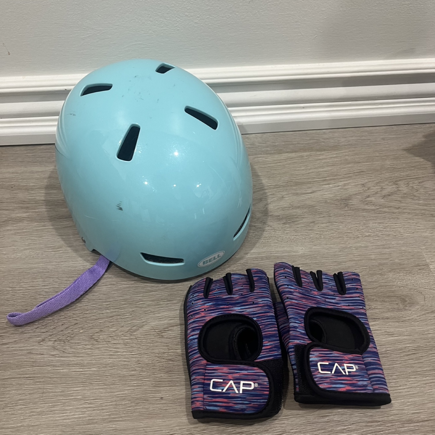light blue OLLIE Bell bicycle helmet with purple strap. Pair of CAP brand fingerless gloves. Multicoloured pattern.