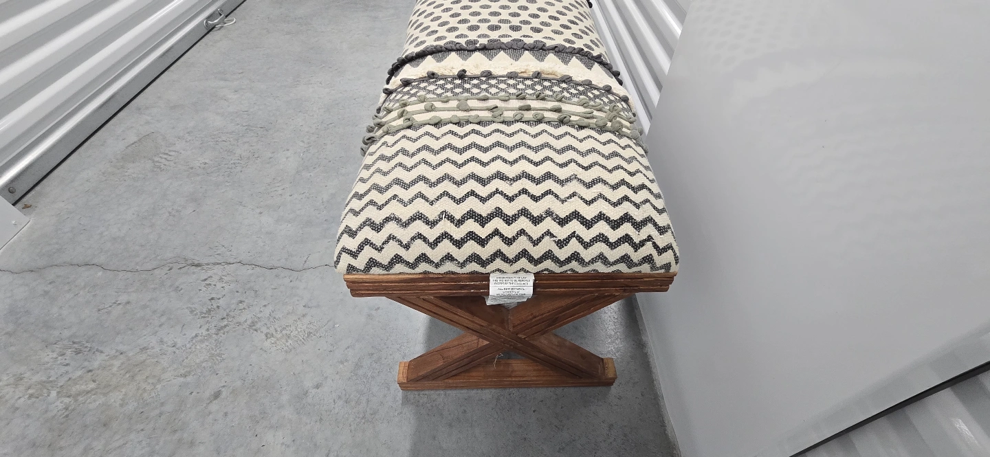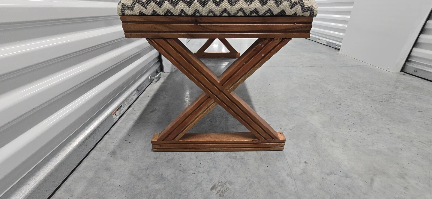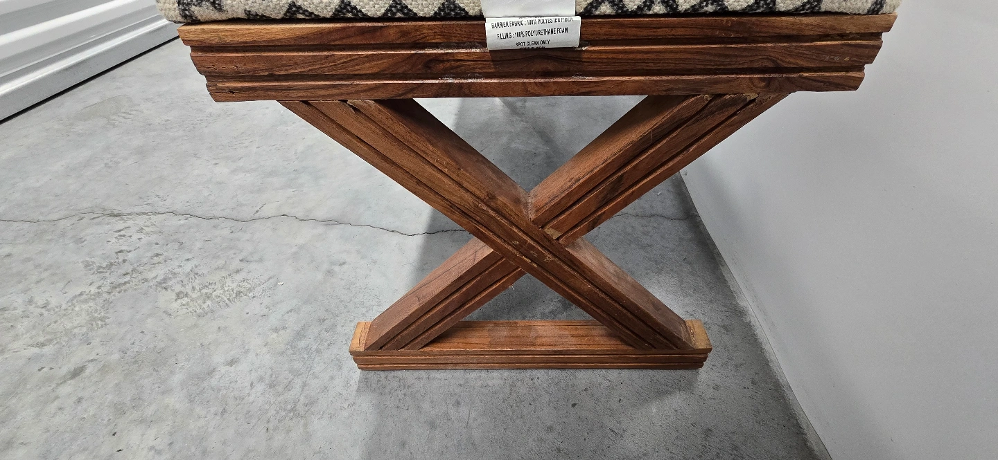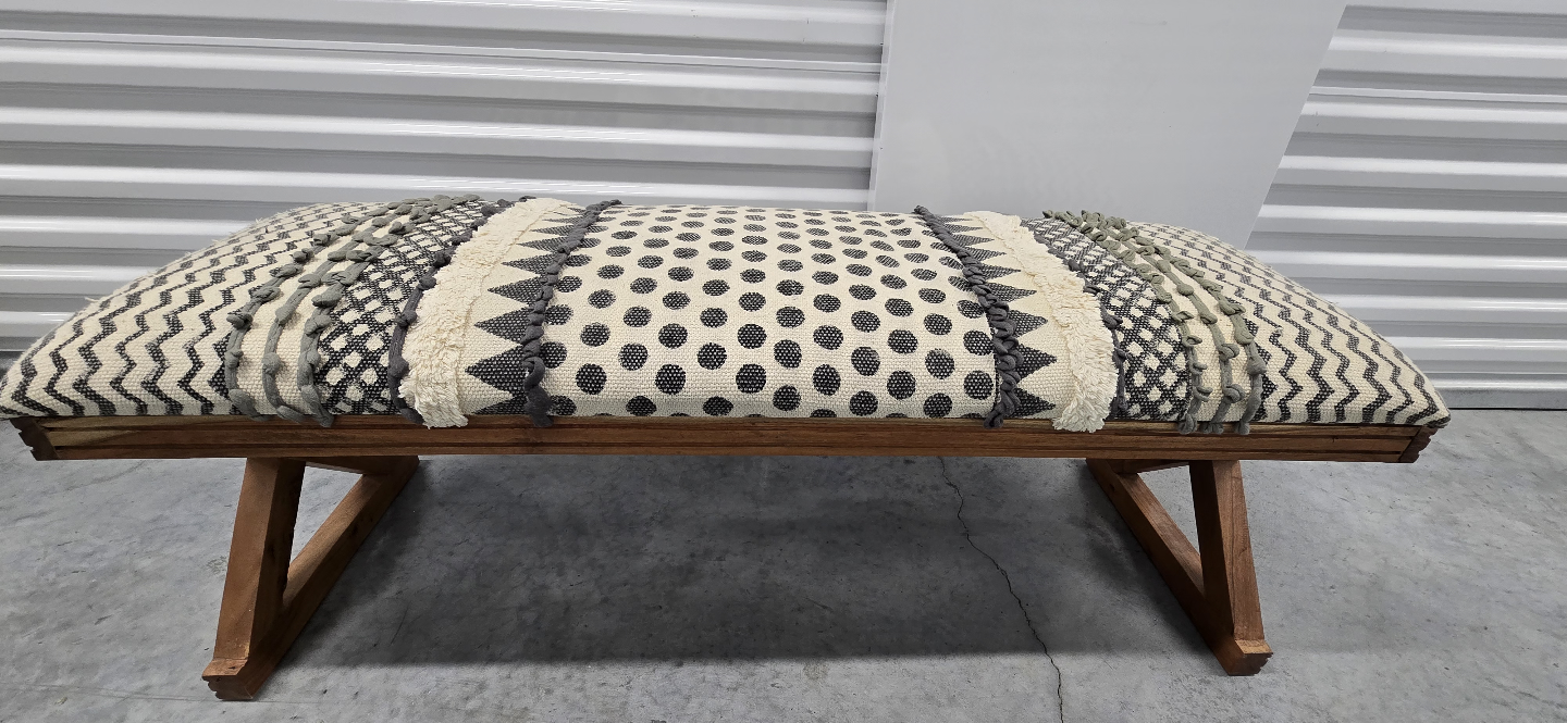 This Unique Bohemian Style bench features a patterned fabric cushion and a dark wood X-shaped base. Perfect for entryway or bedroom.